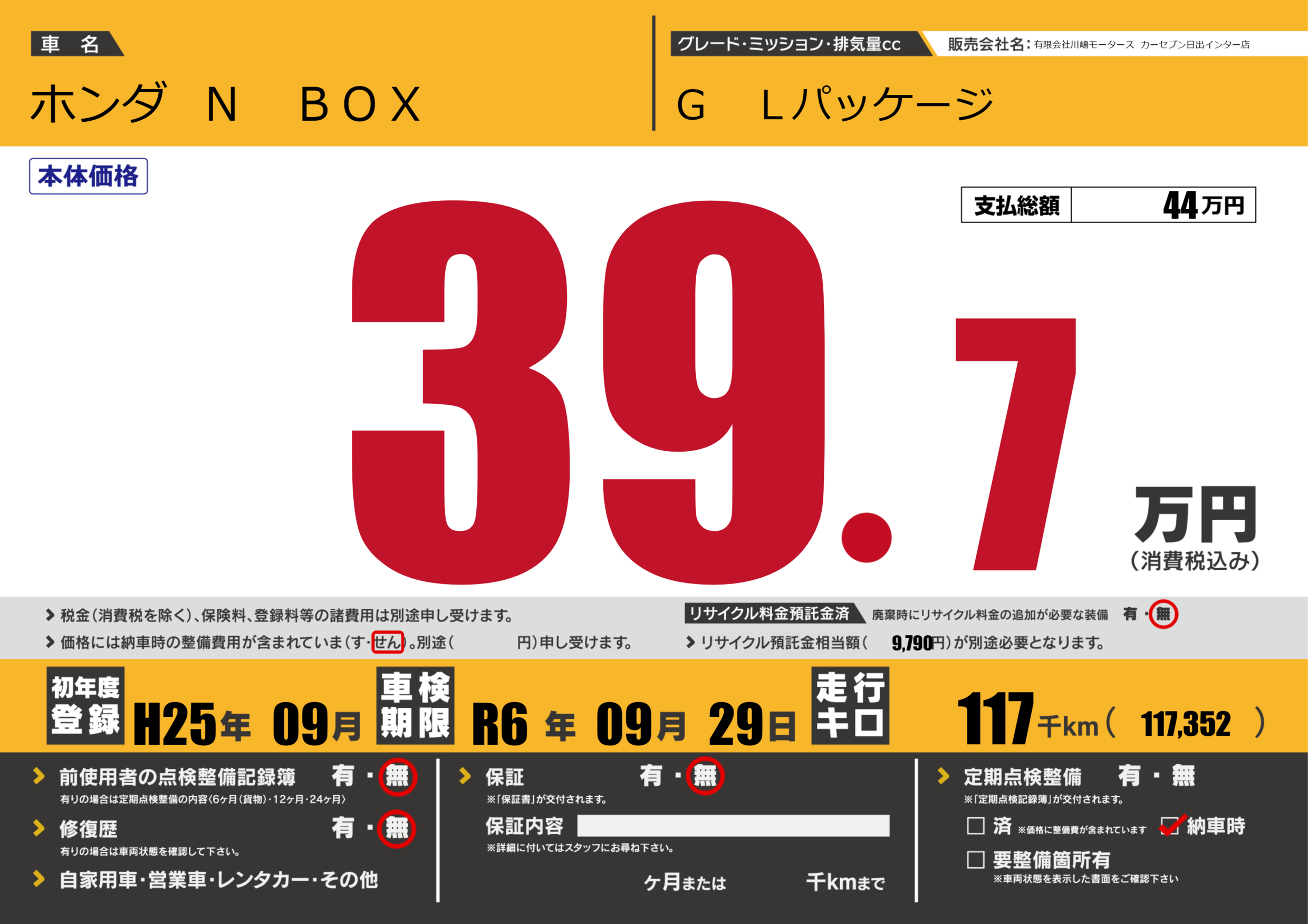 | 車名 | ホンダ N BOX | グレード ミッション 排気量 |
