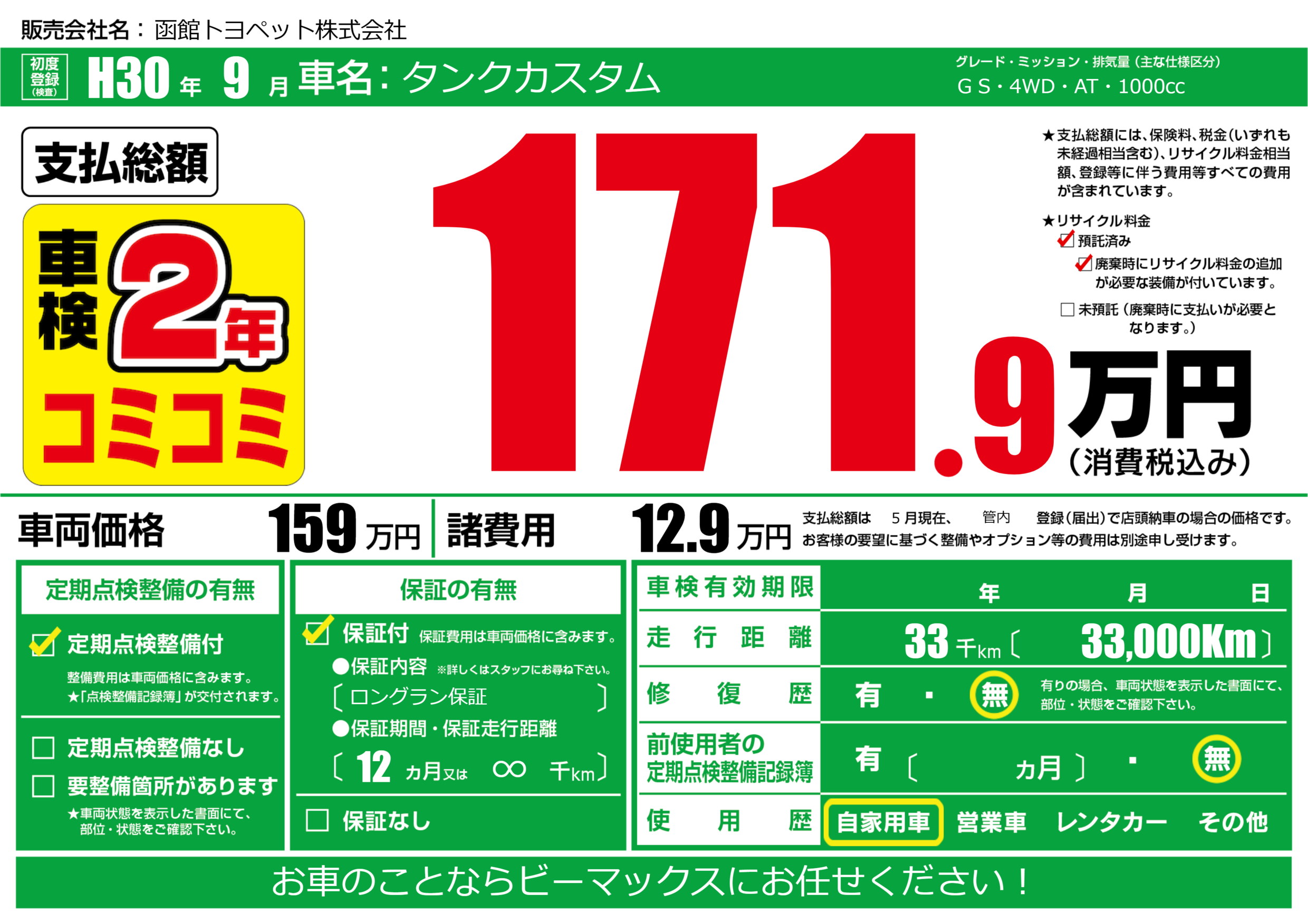 | 車名 | タンクカスタム | グレード ミッション 排気量 |