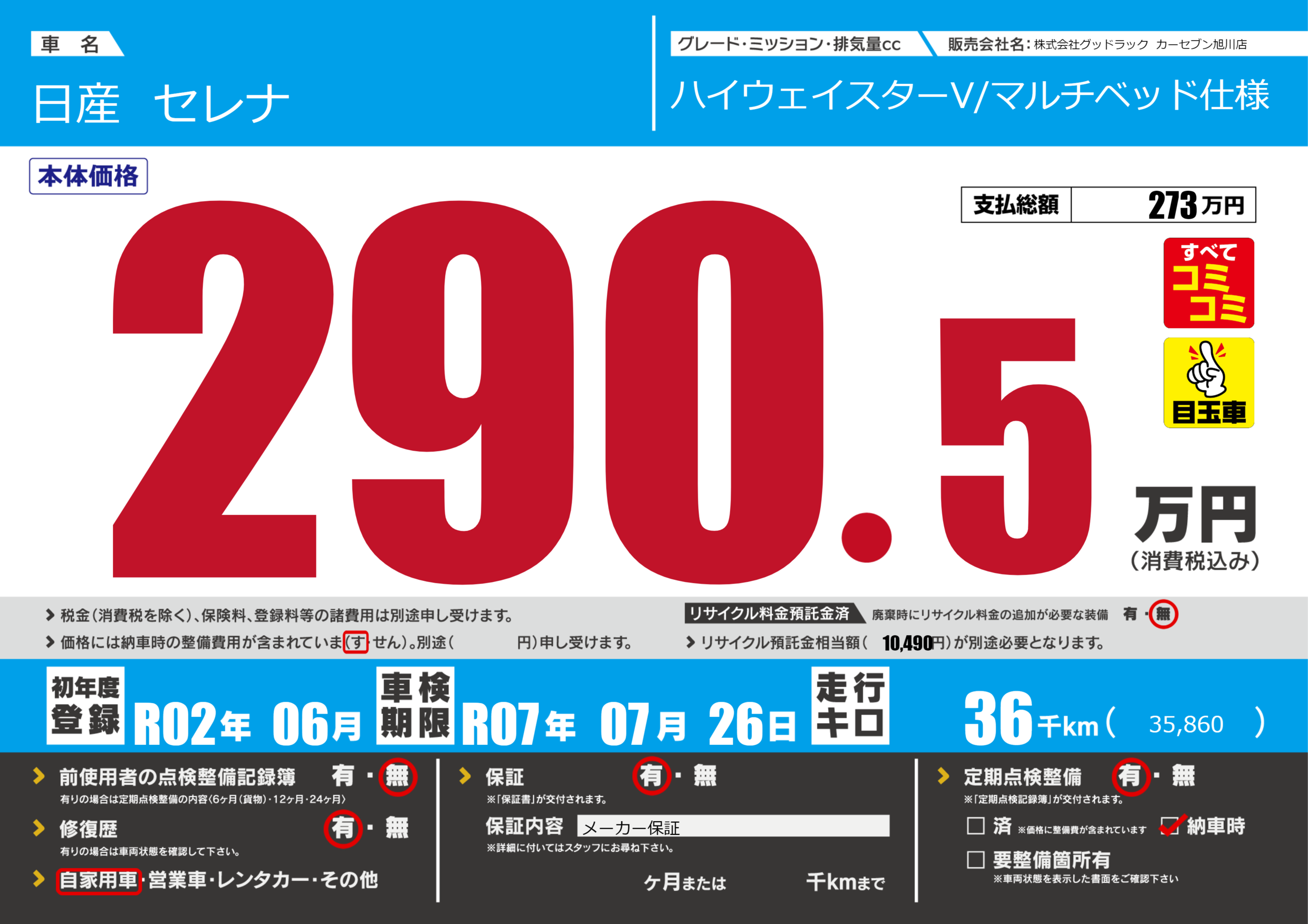 | 車名 | 日産 セレナ | グレード ミッション 排気量 |