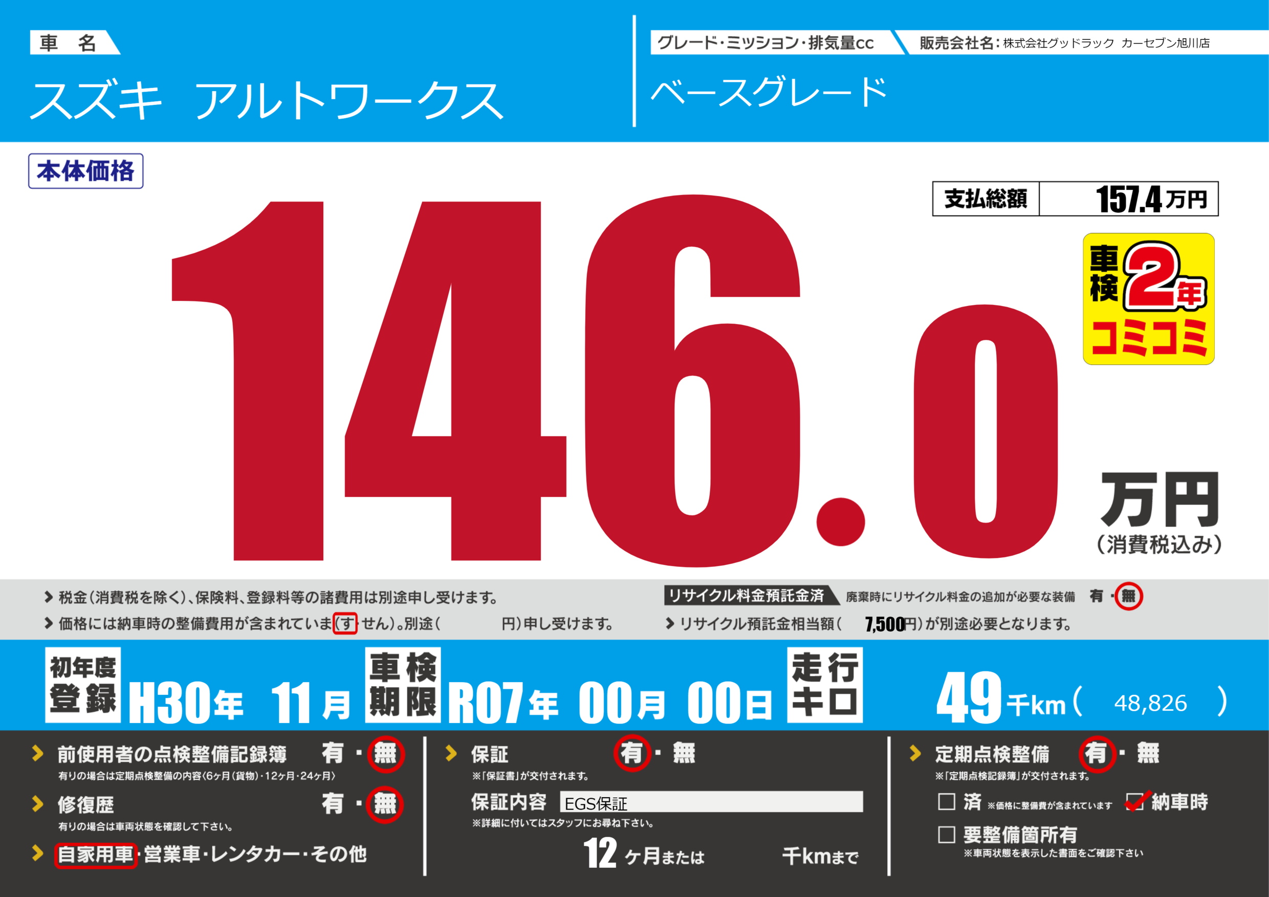 | 車検制限 | R07年 00月 00日 | ||