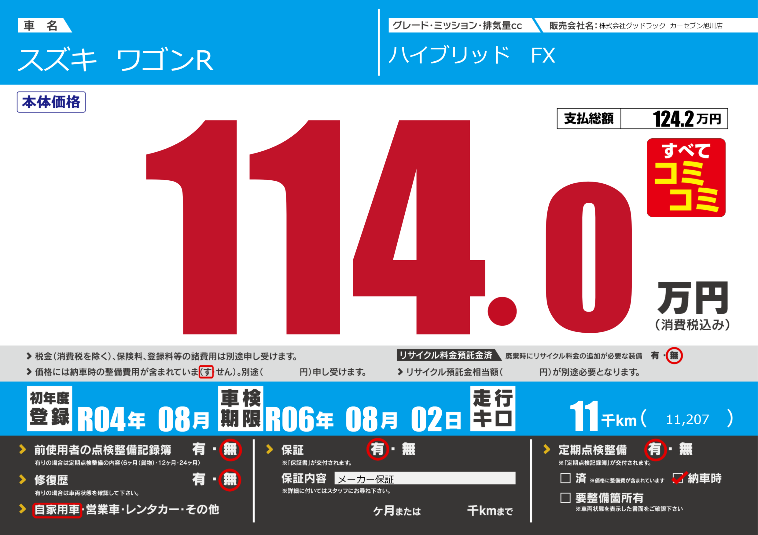 | 走行キロ | 1.1万km | 初年度登録 | R04年08月 |