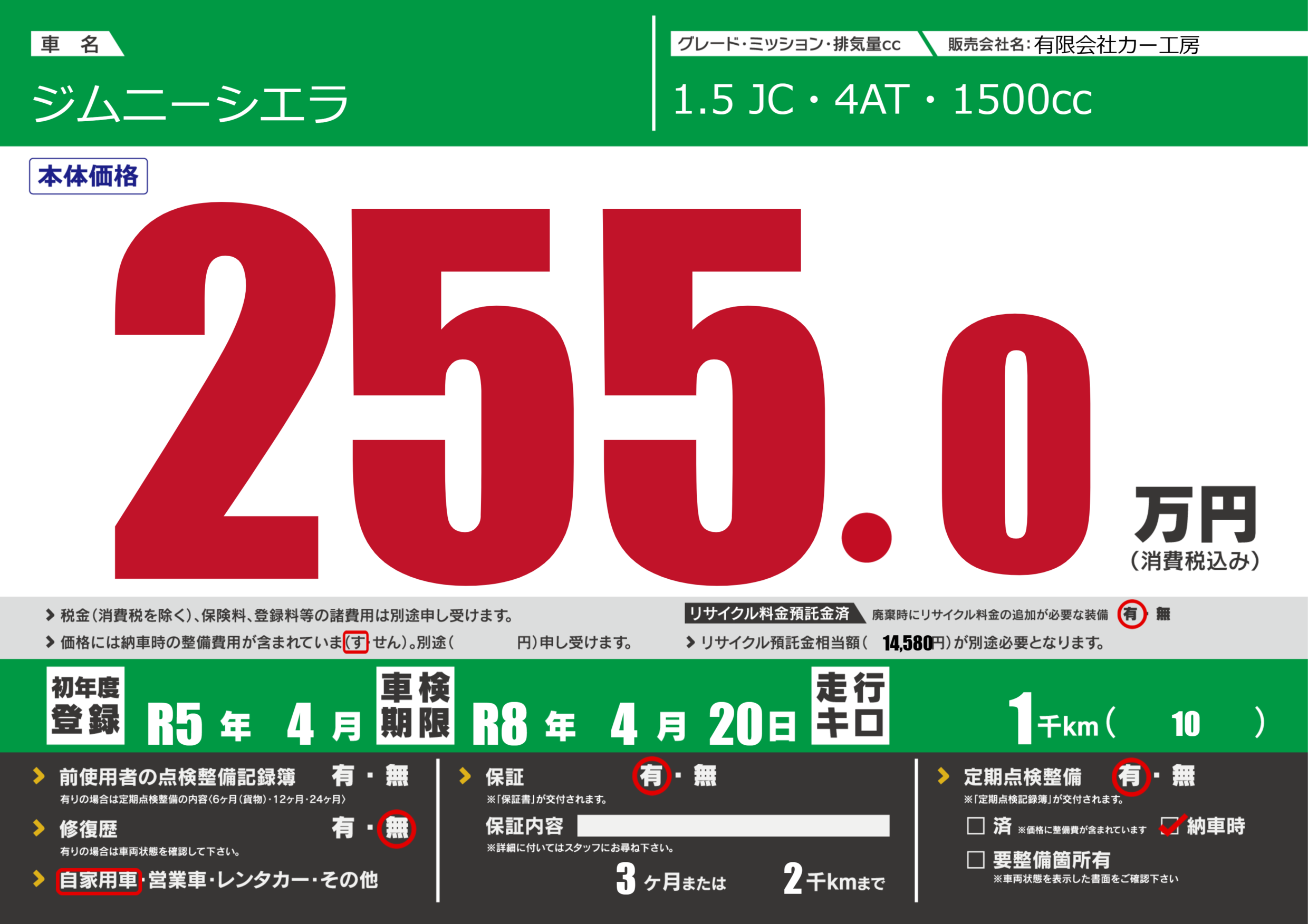 | 車名 | ジムニーシエラ | グレード ミッション 排気量 |