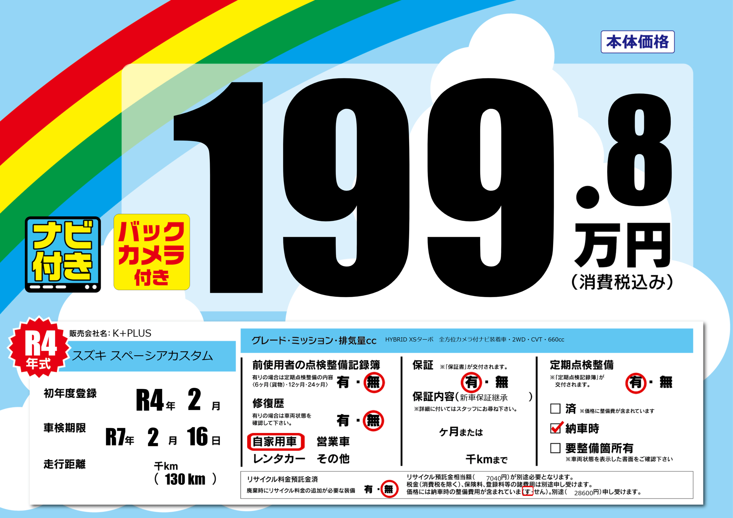 | 車名 | スズキ スペーシアカスタム | グレード ミッション 排気量 |