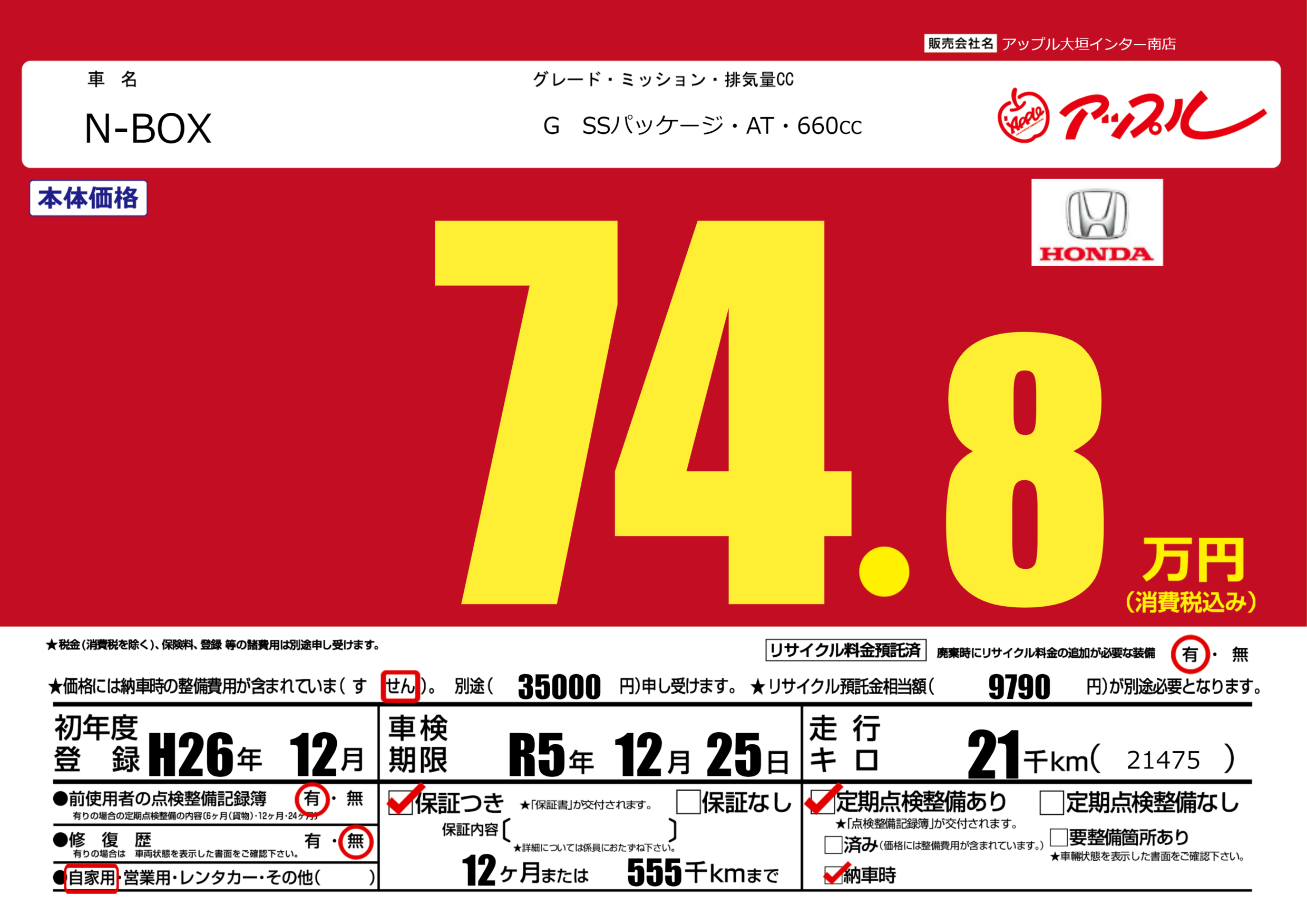 | 車名 | N-BOX | グレード ミッション 排気量 |