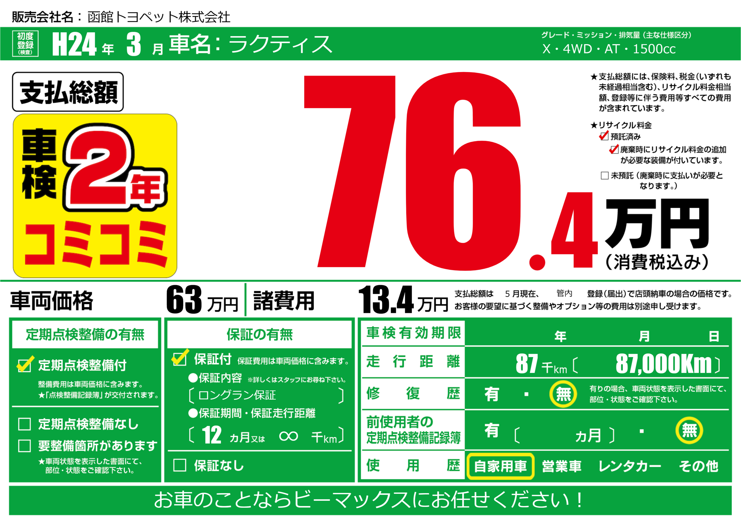 | 車名 | ラクティス | グレード ミッション 排気量 |