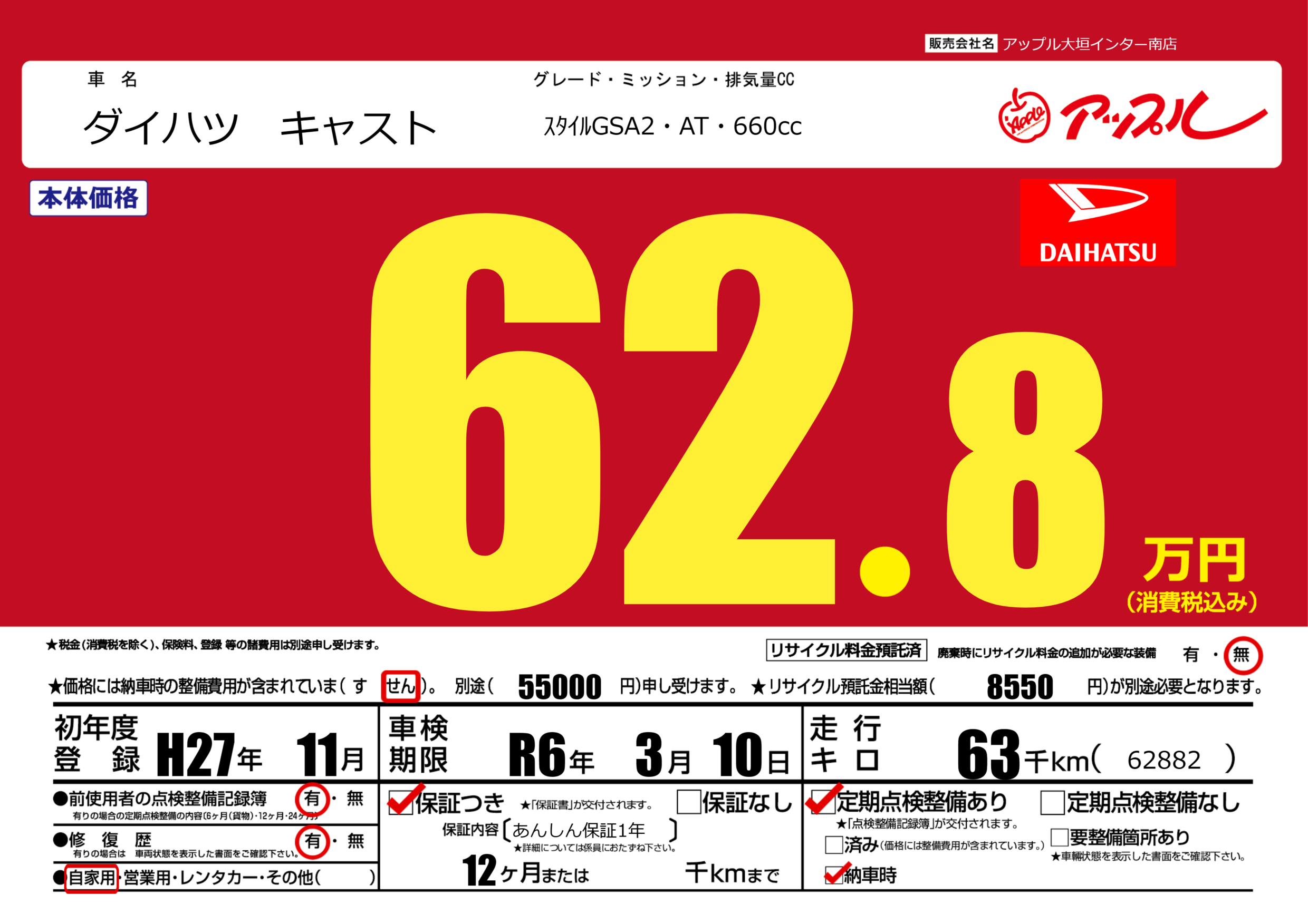 保証付き 保証内容(あんしん保証1年) 12ヶ月または千km |