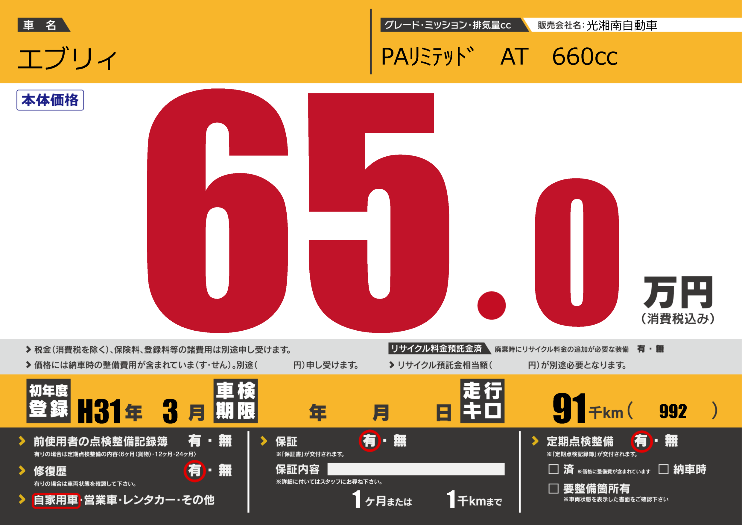 | 車名 | エブリィ | グレード ミッション 排気量 |