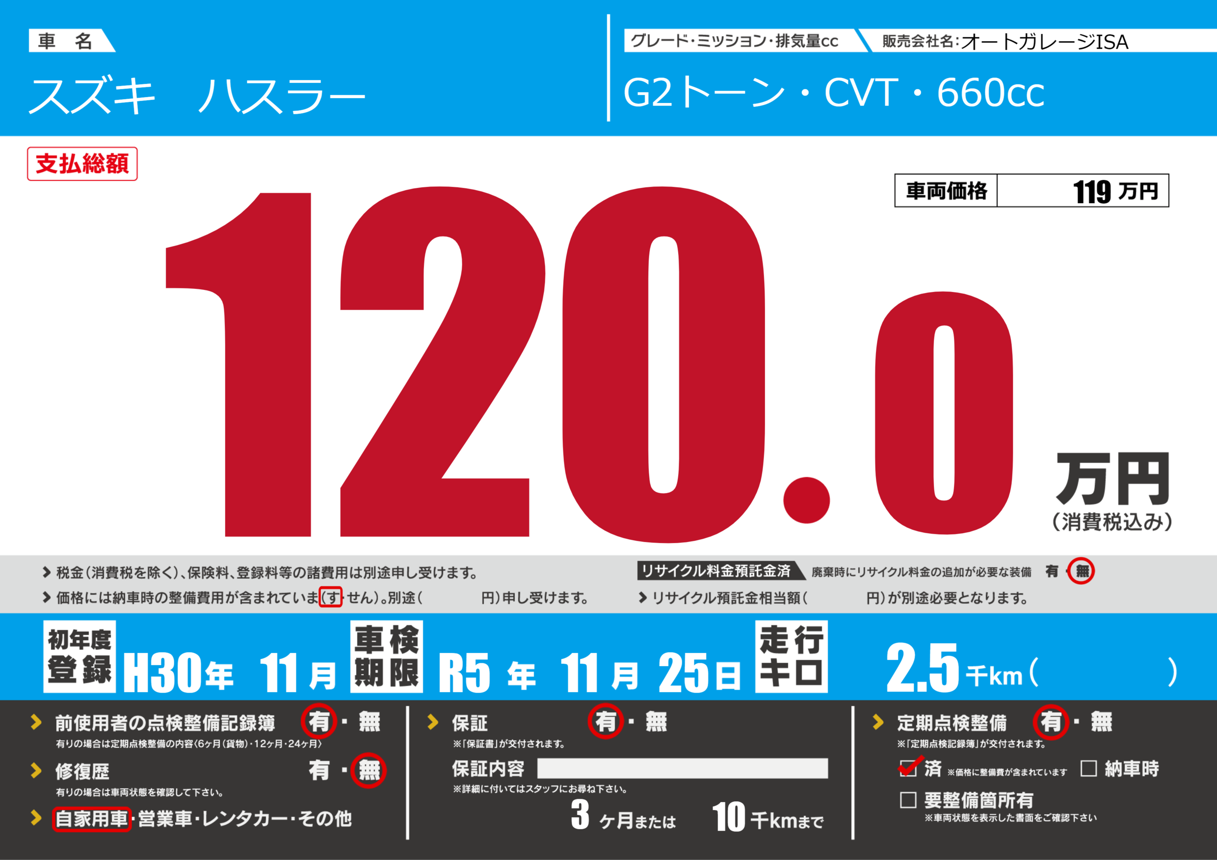 | 定期点検整備 | 定期点検整備あり 定期点検整備済み | ||