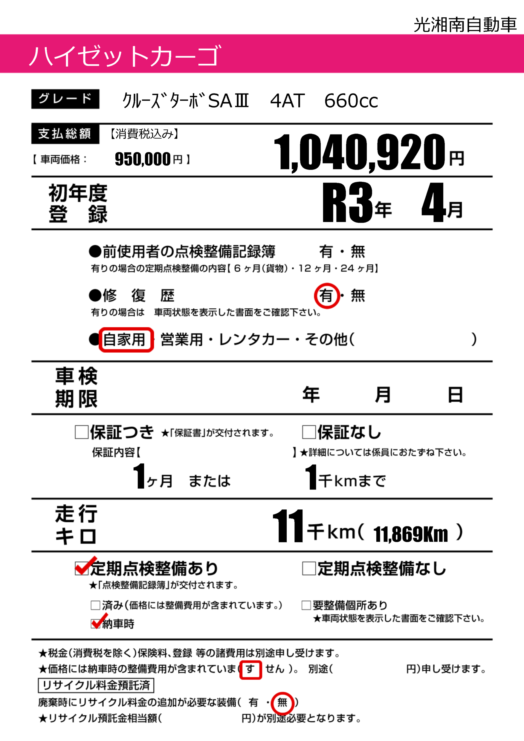 | 定期点検整備 | 定期点検整備あり 納車時あり | ||