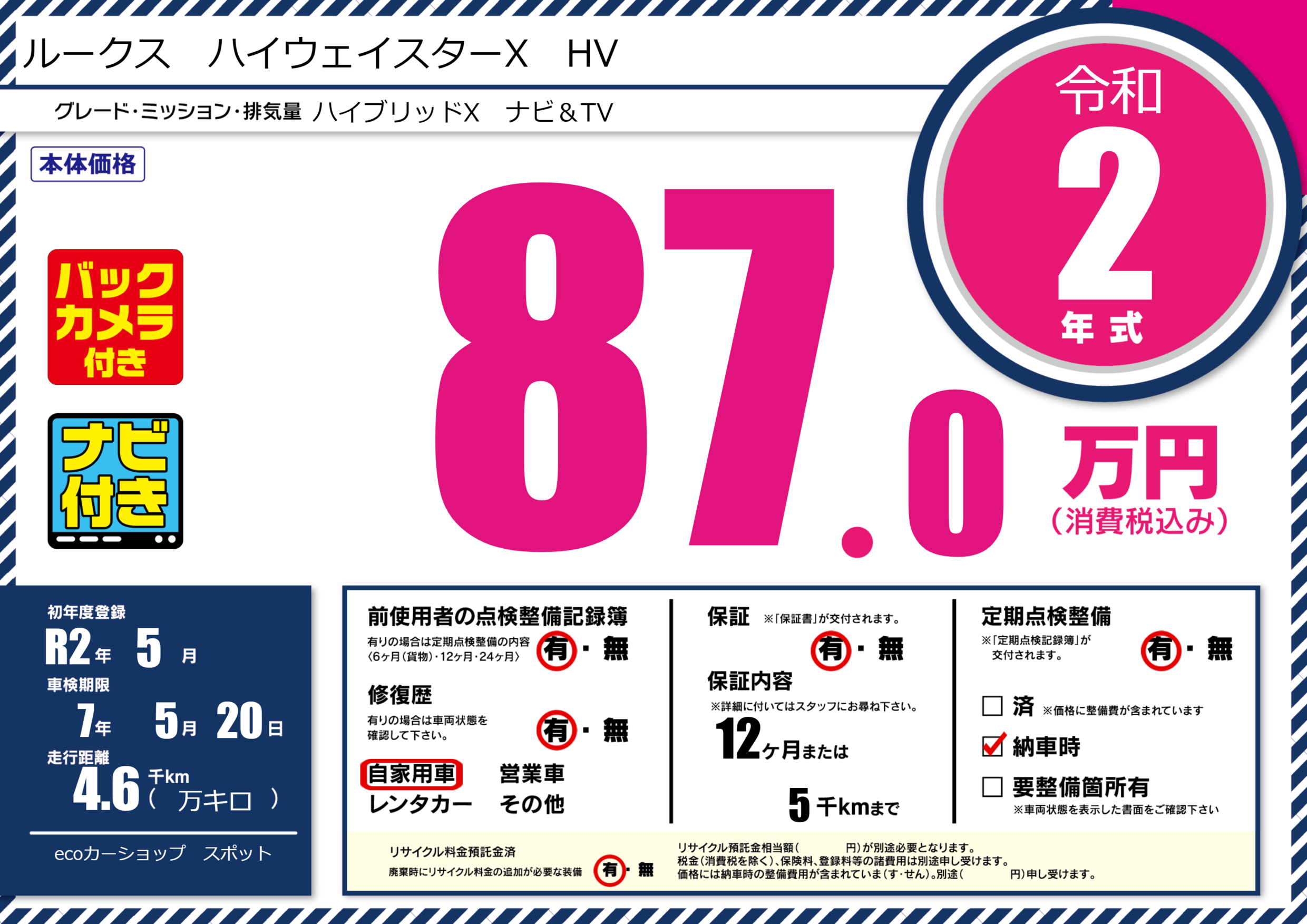 | 車名 | ルークス ハイウェイスターX HV | グレード ミッション 排気量 |