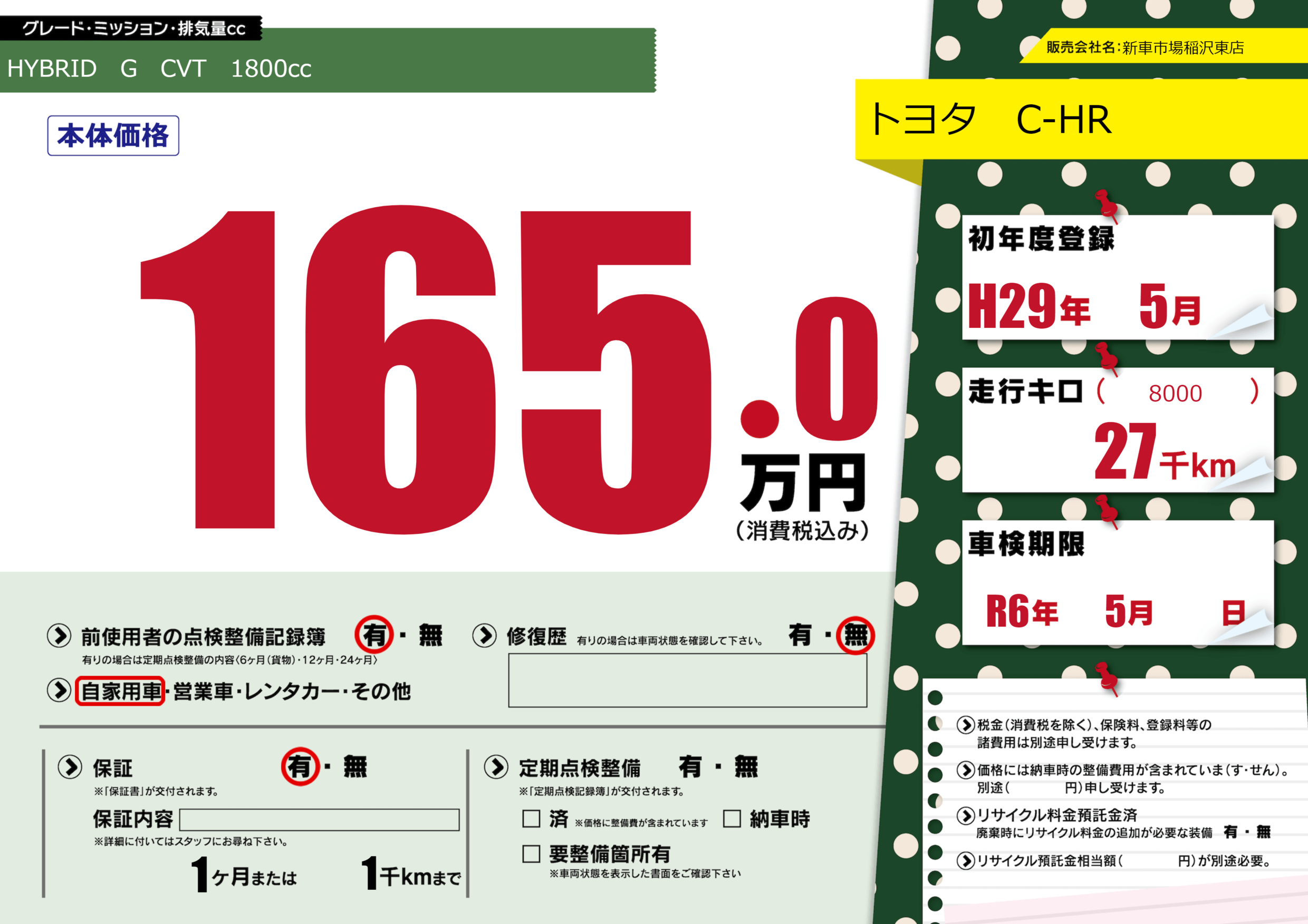 | 車名 | トヨタ C-HR | グレード ミッション 排気量 |