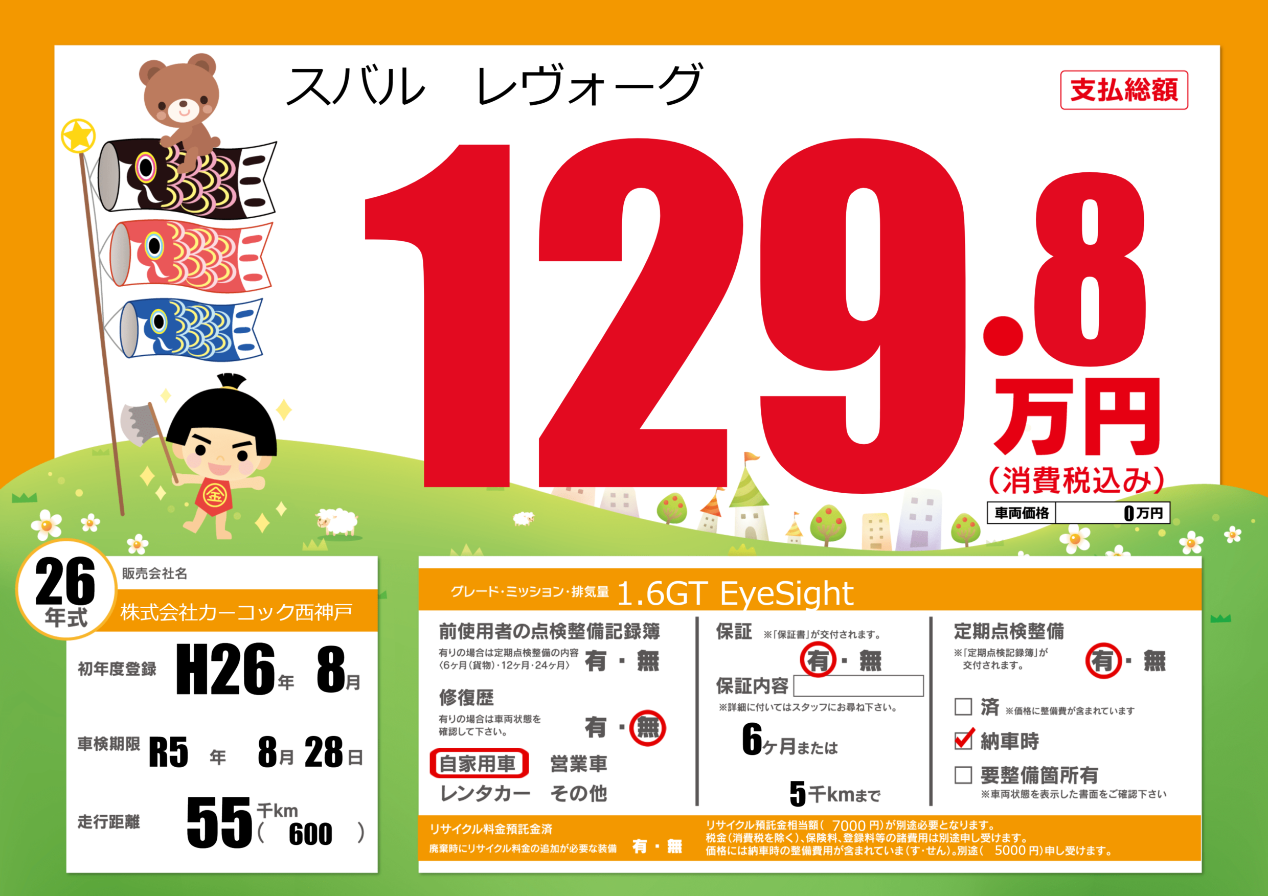 | 走行キロ | 5.5万km | 初年度登録 | H26年8月 |