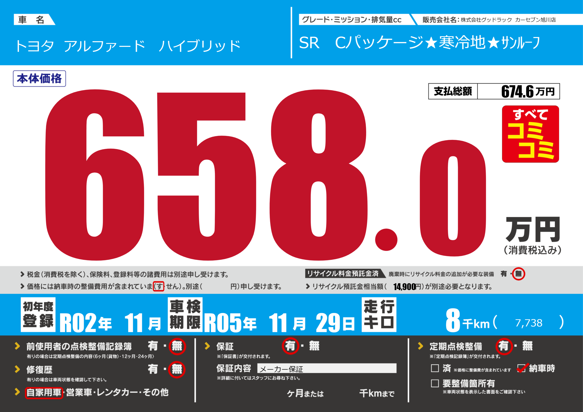 | 走行キロ | 0.8万km | 初年度登録 | R02年11月 |