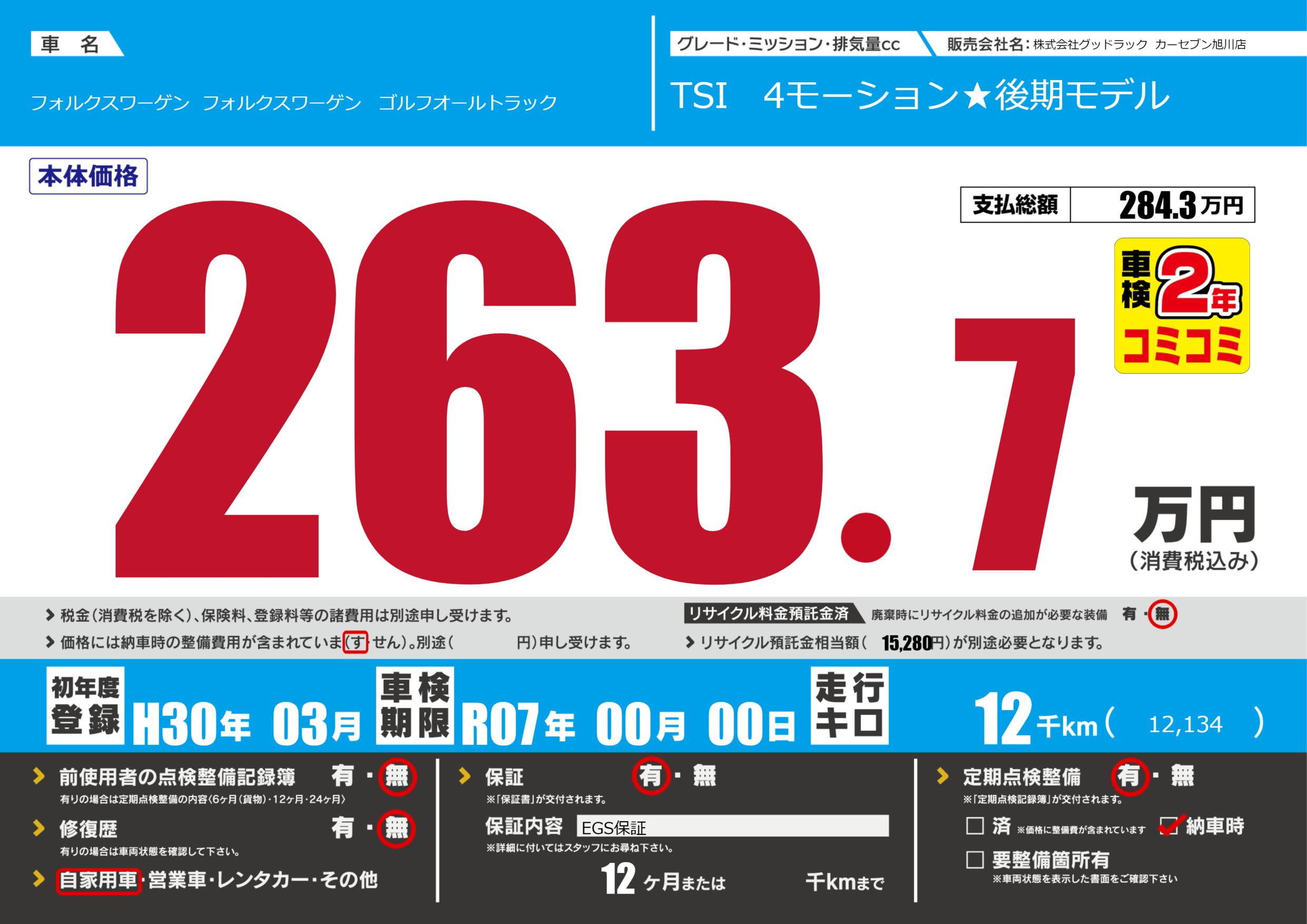 | 車名 | フォルクスワーゲン フォルクスワーゲン ゴルフオールトラック | グレード ミッション 排気量 |