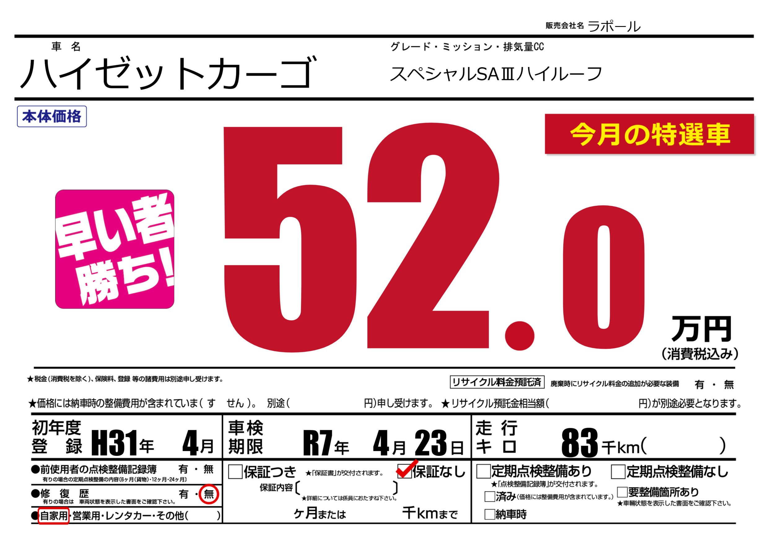 | 車名 | ハイゼットカーゴ | グレード ミッション 排気量 |