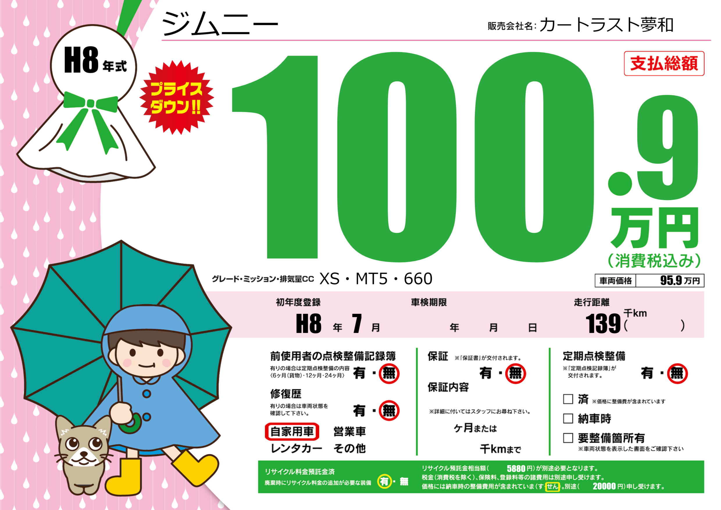| 走行キロ | 13.9万km | 初年度登録 | H8年7月 |