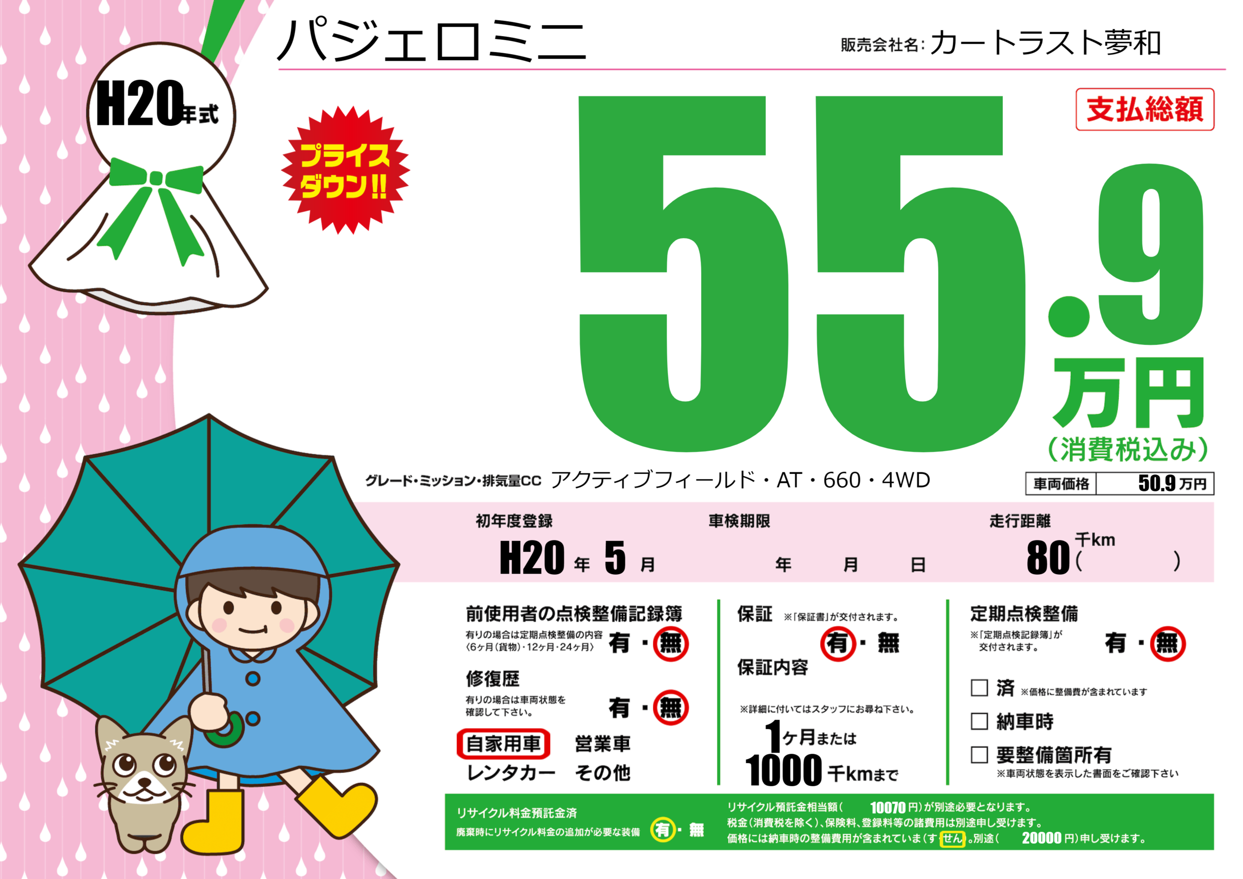 | 走行キロ | 8万km | 初年度登録 | H20年5月 |