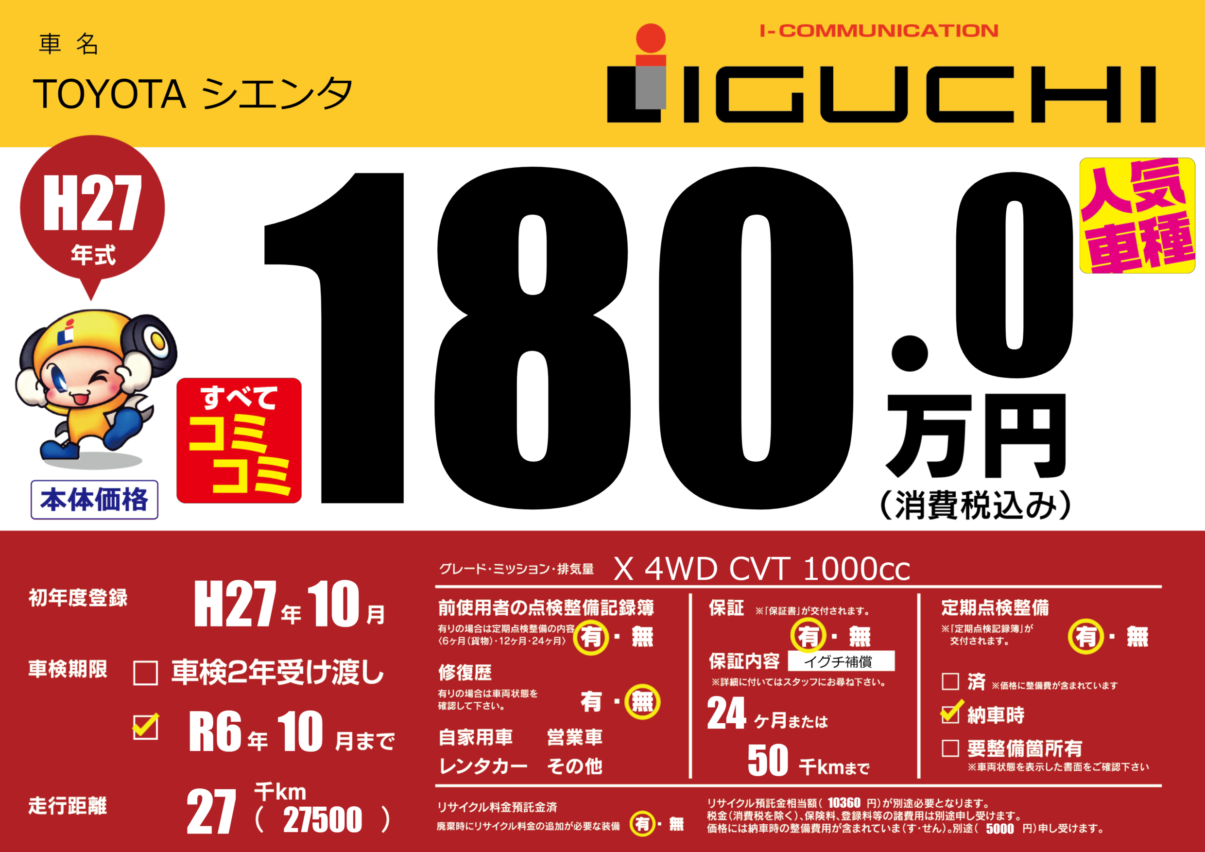 保証付き 保証内容(イグチ補償) 24ヶ月または(50)千kmまで |