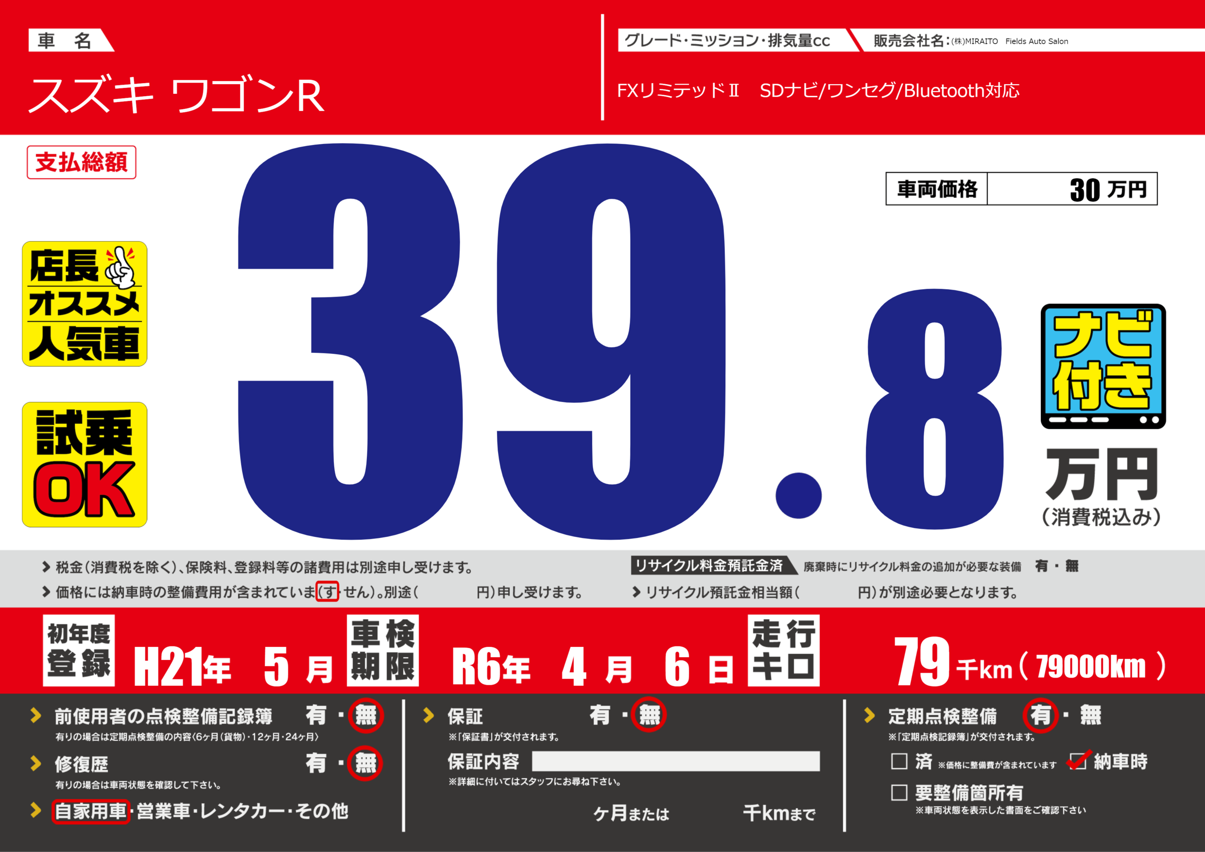 | 走行キロ | 7.9万km | 初年度登録 | H21年5月 |
