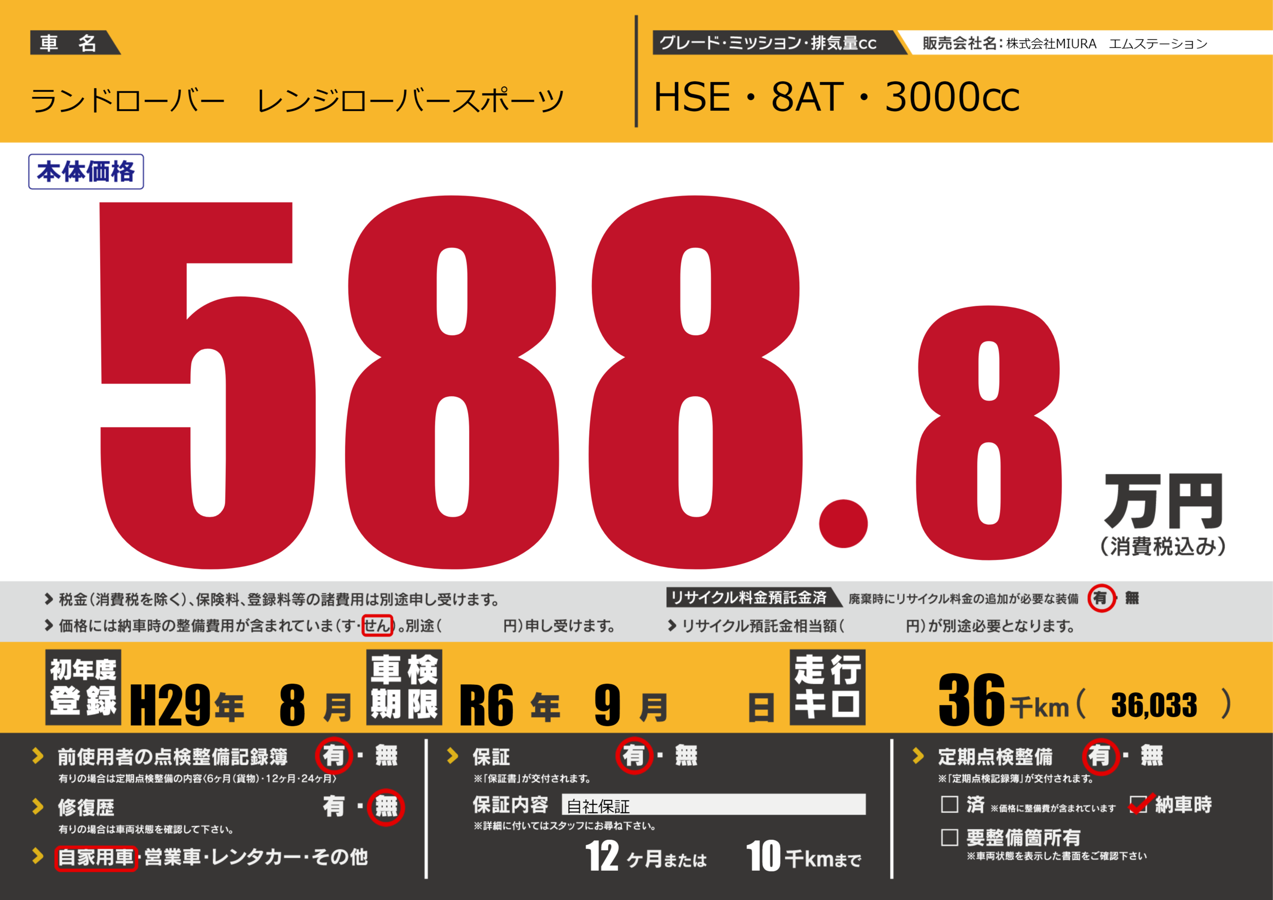 | 車名 | ランドローバー レンジローバースポーツ | グレード ミッション 排気量 |