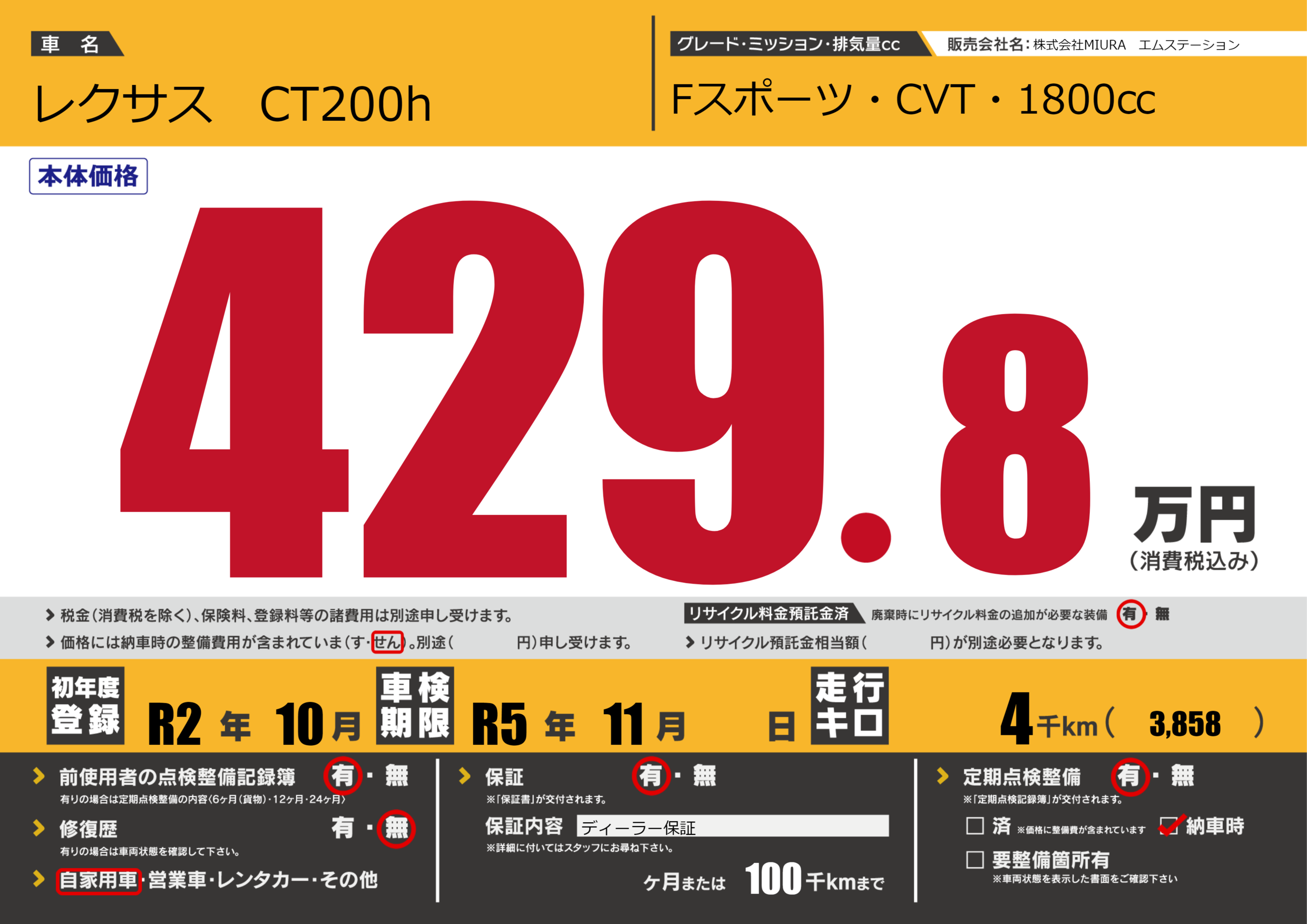 | 車名 | レクサス CT200h | グレード ミッション 排気量 |