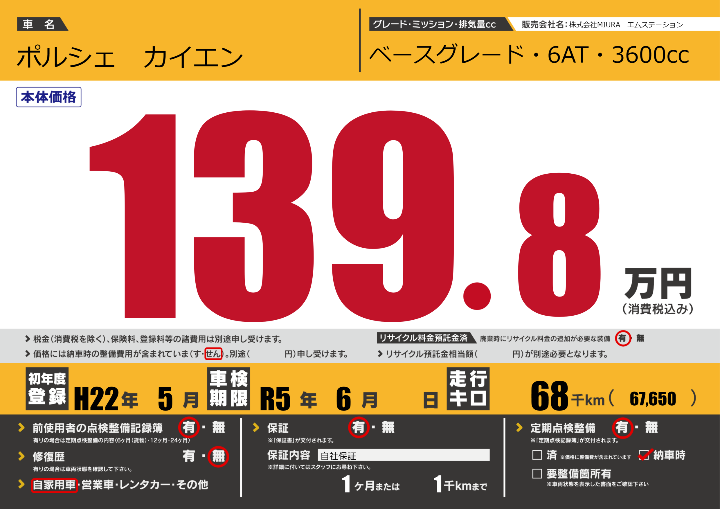 | 車名 | ポルシェ カイエン | グレード ミッション 排気量 |