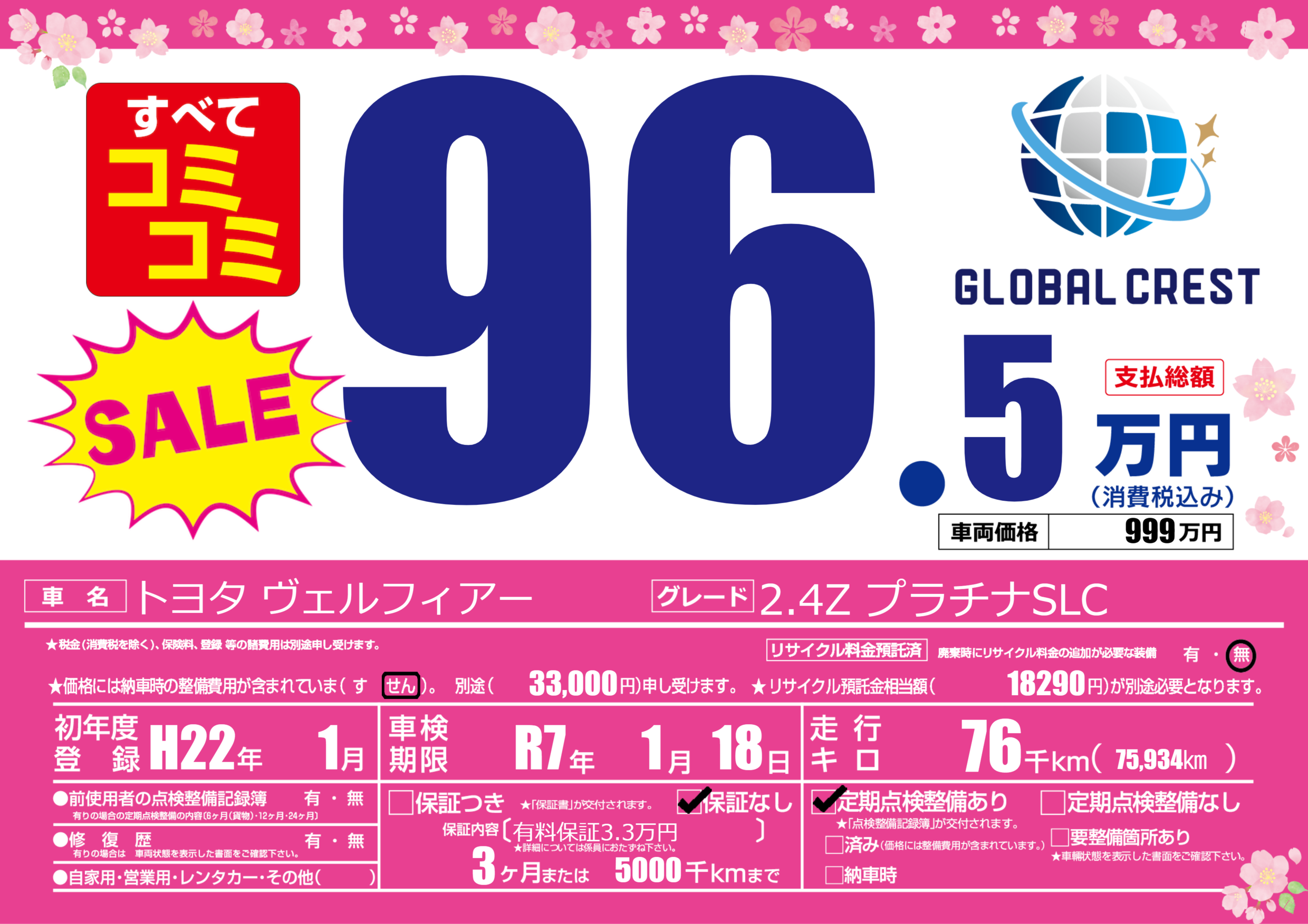 | 走行キロ | 7.6万km | 初年度登録 | H22年1月 |