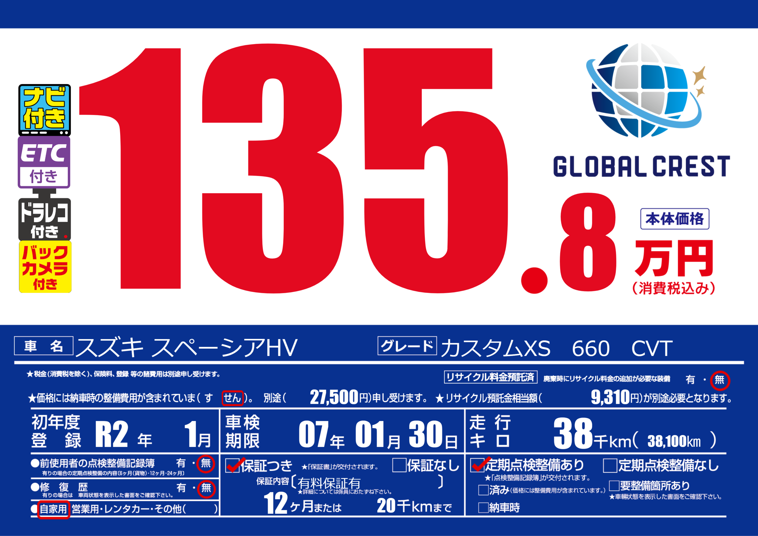 | 走行キロ | 3.8万km | 初年度登録 | R2年1月 |