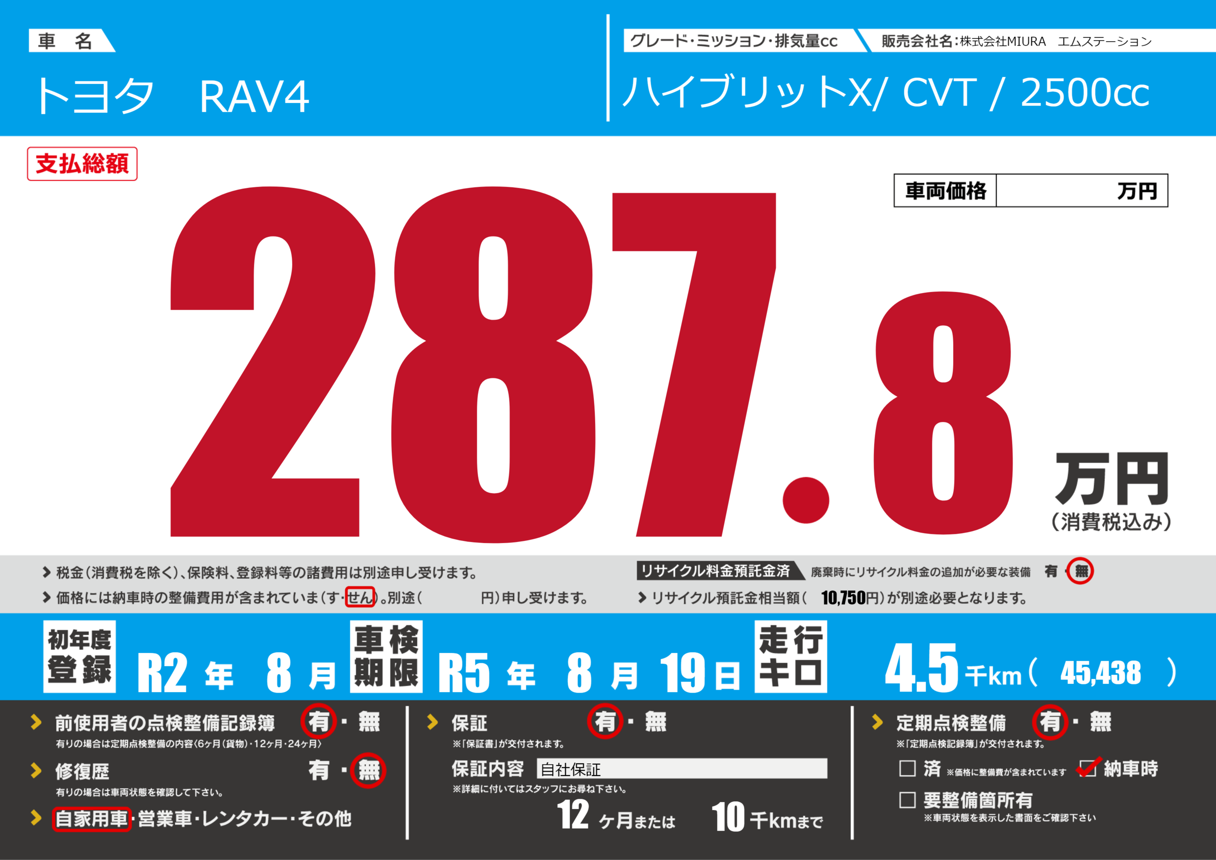 保証付き 保証内容(自社保証) 12ヶ月または(10)千kmまで |