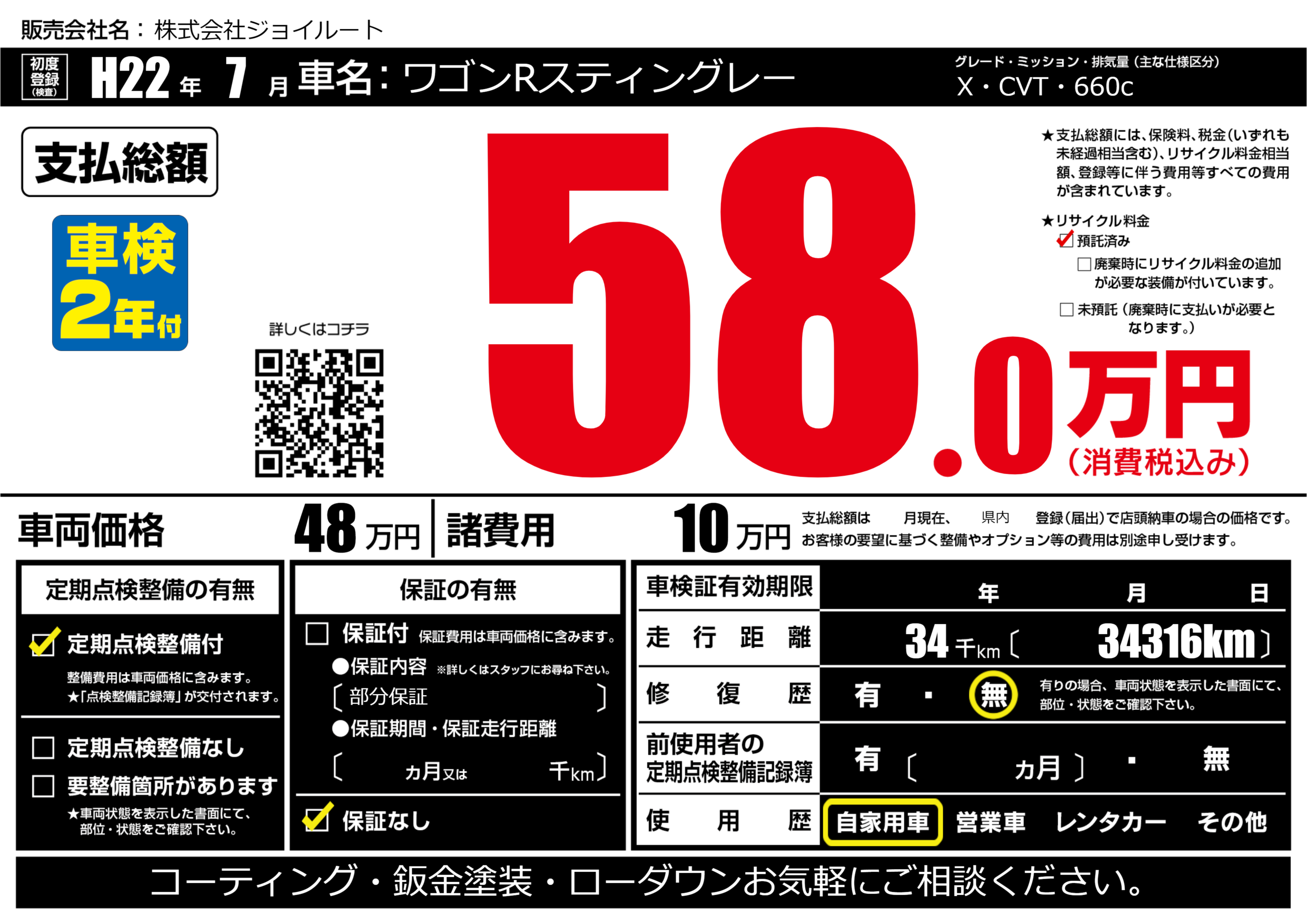 | 走行キロ | 3.4万km | 初年度登録 | H22年7月 |