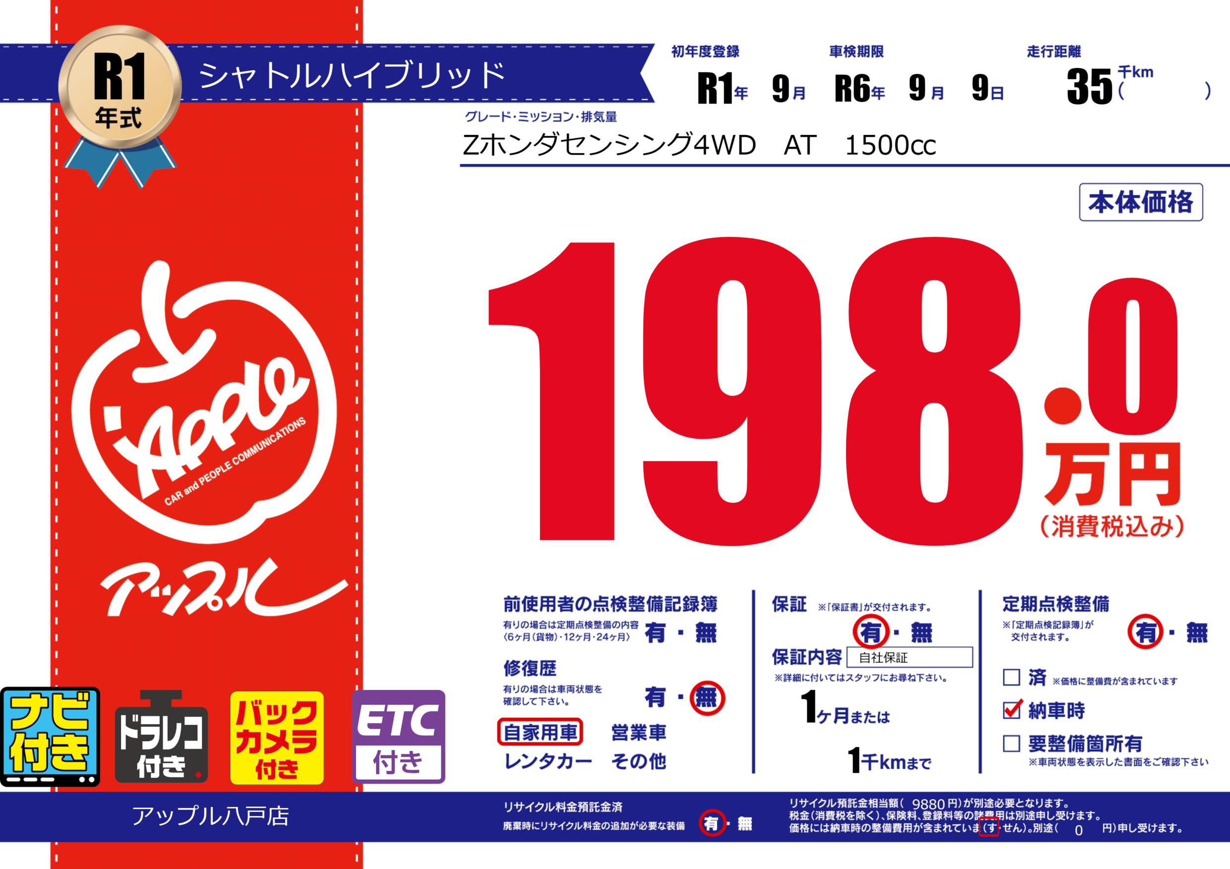 保証付き 保証内容( 自社保証) 1ヶ月または(1)千kmまで |