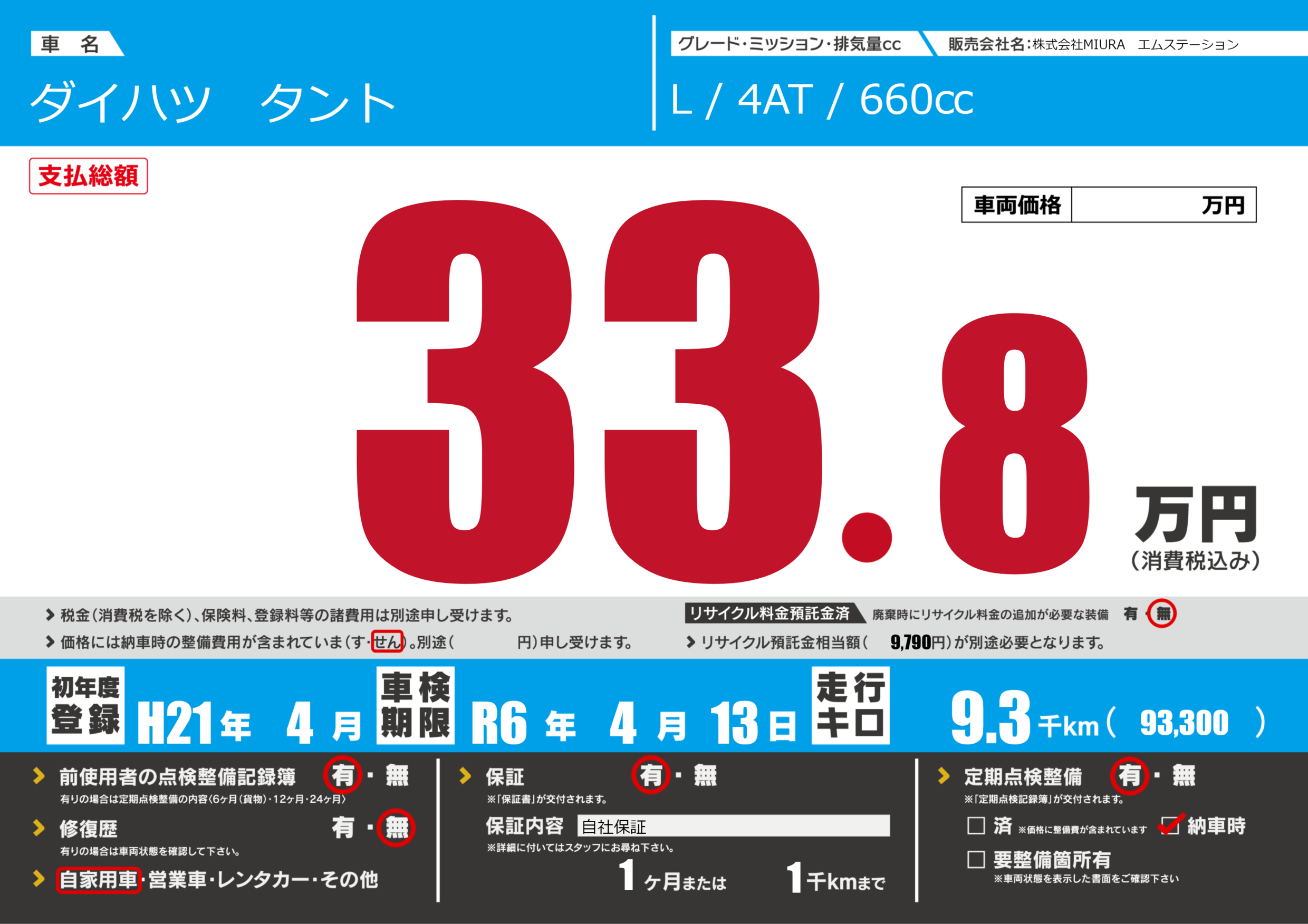 | 車名 | ダイハツ タント | グレード ミッション 排気量 |