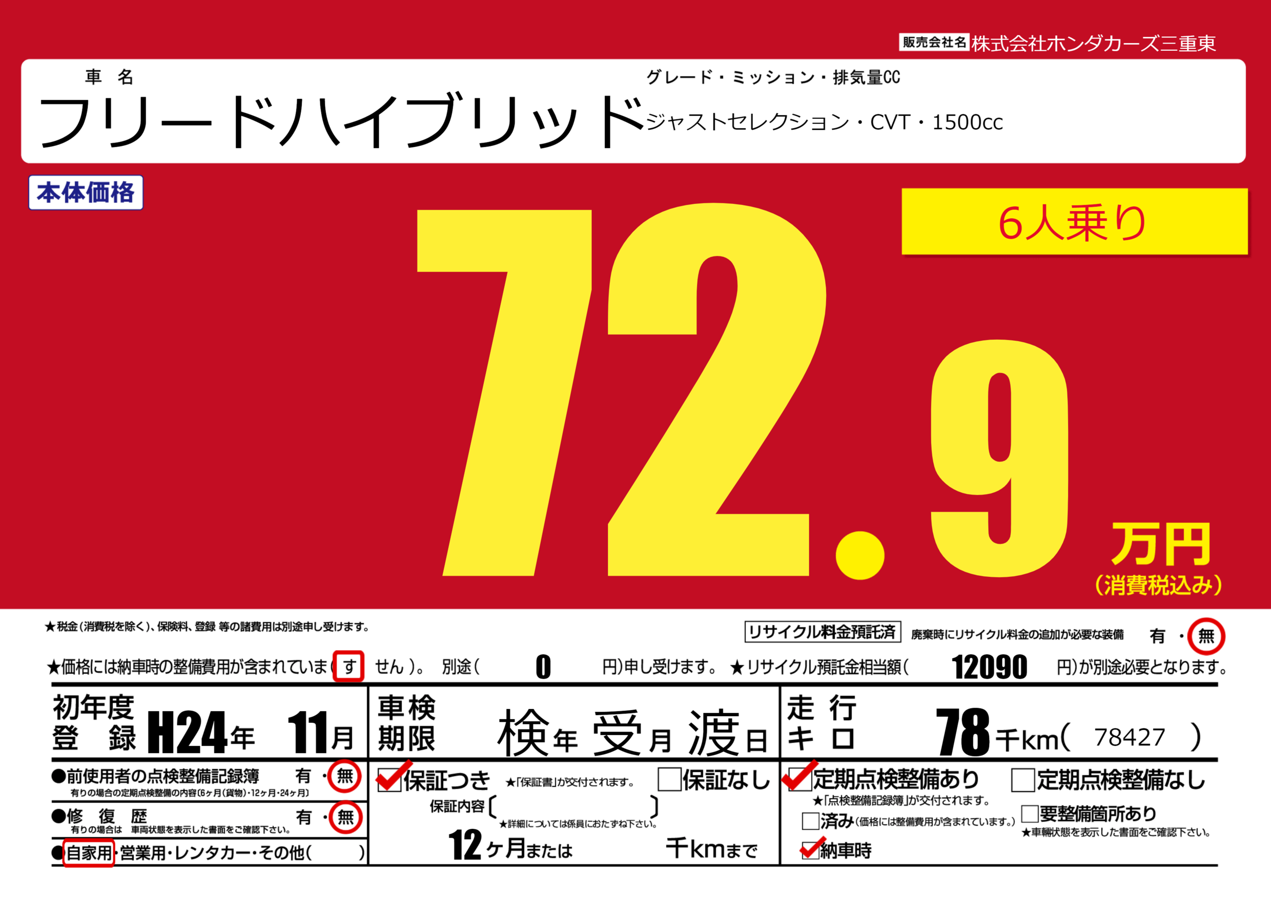 | 車名 | フリードハイブリッド | グレード ミッション 排気量 |