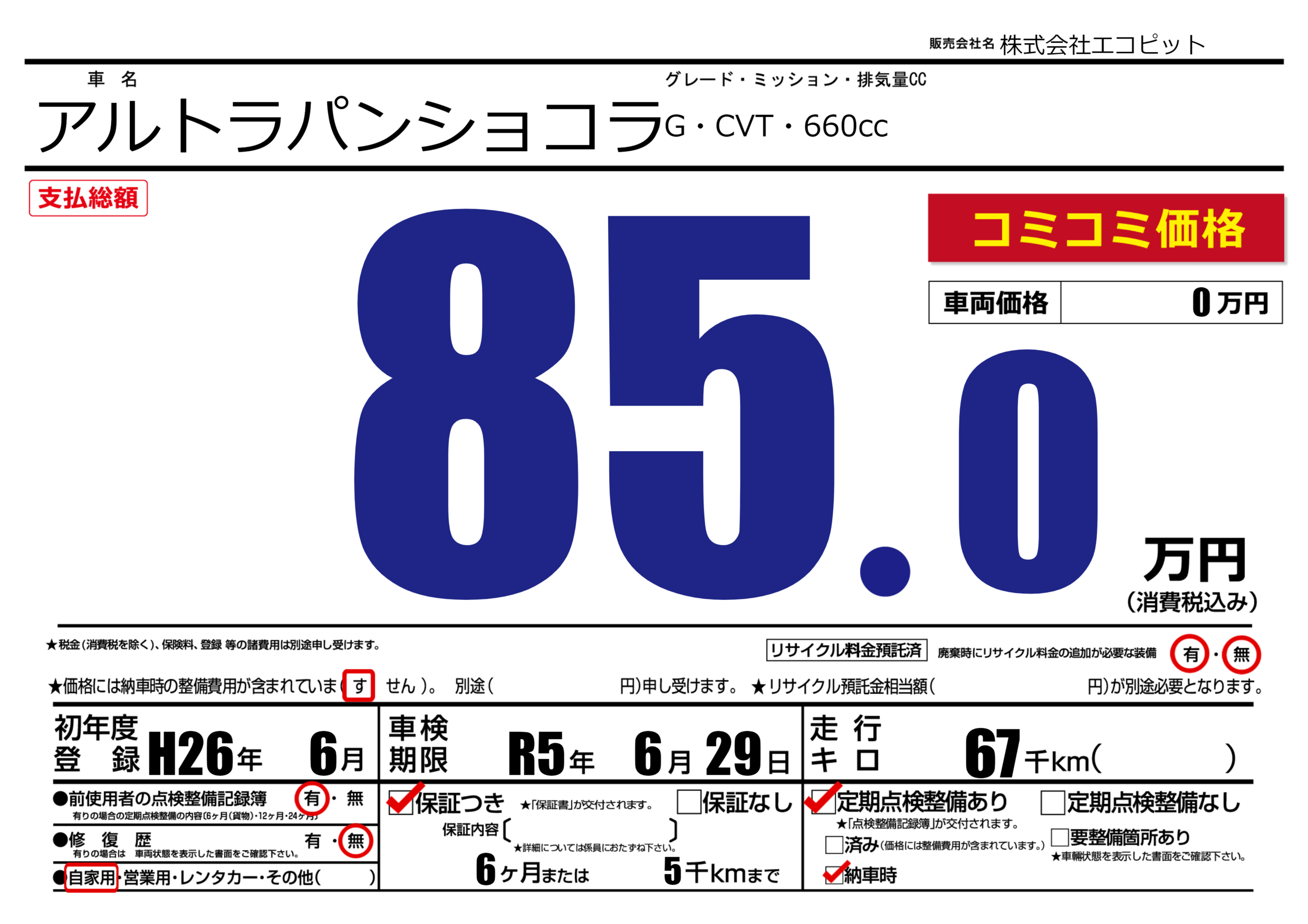 保証付き 保証内容(---) 6ヶ月または(5)千kmまで |