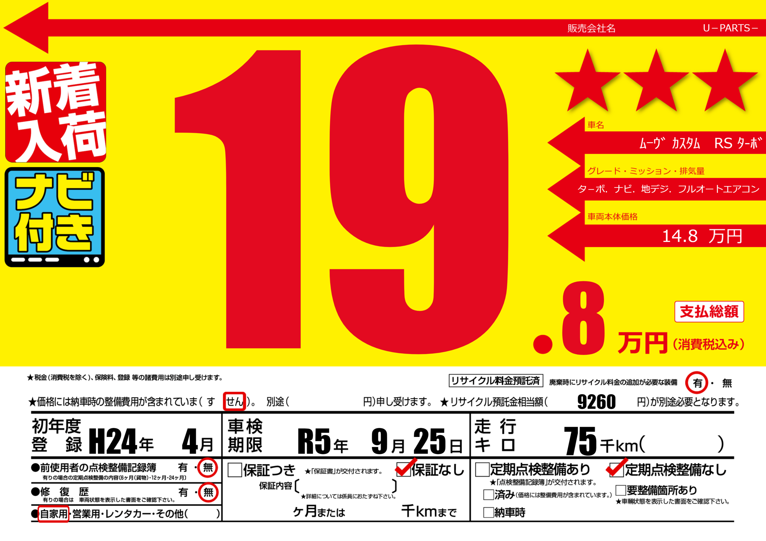 | 車名 | ムーヴ カスタム RS タ-ボ | グレード ミッション 排気量 |