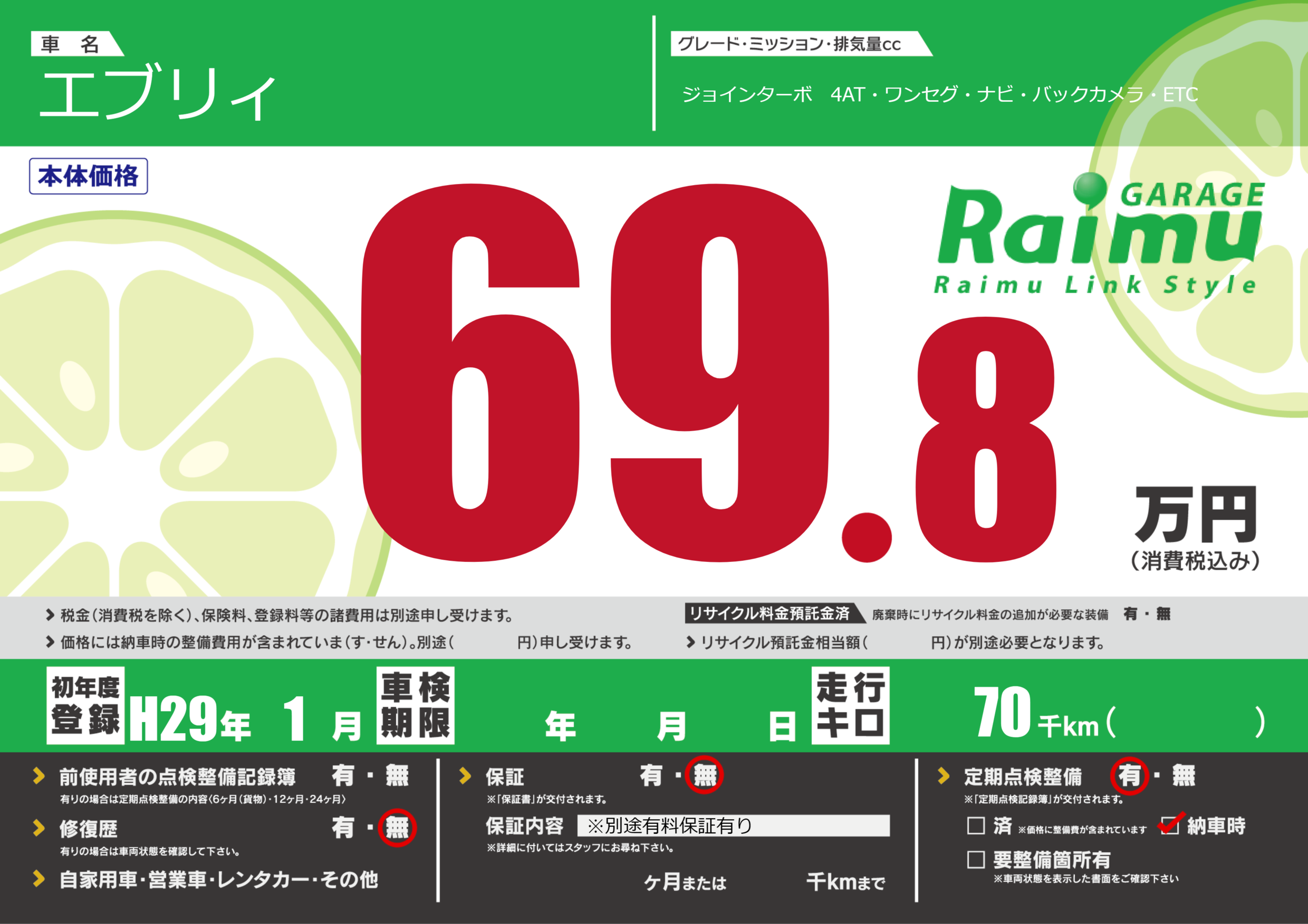 | 車名 | エブリィ | グレード ミッション 排気量 |