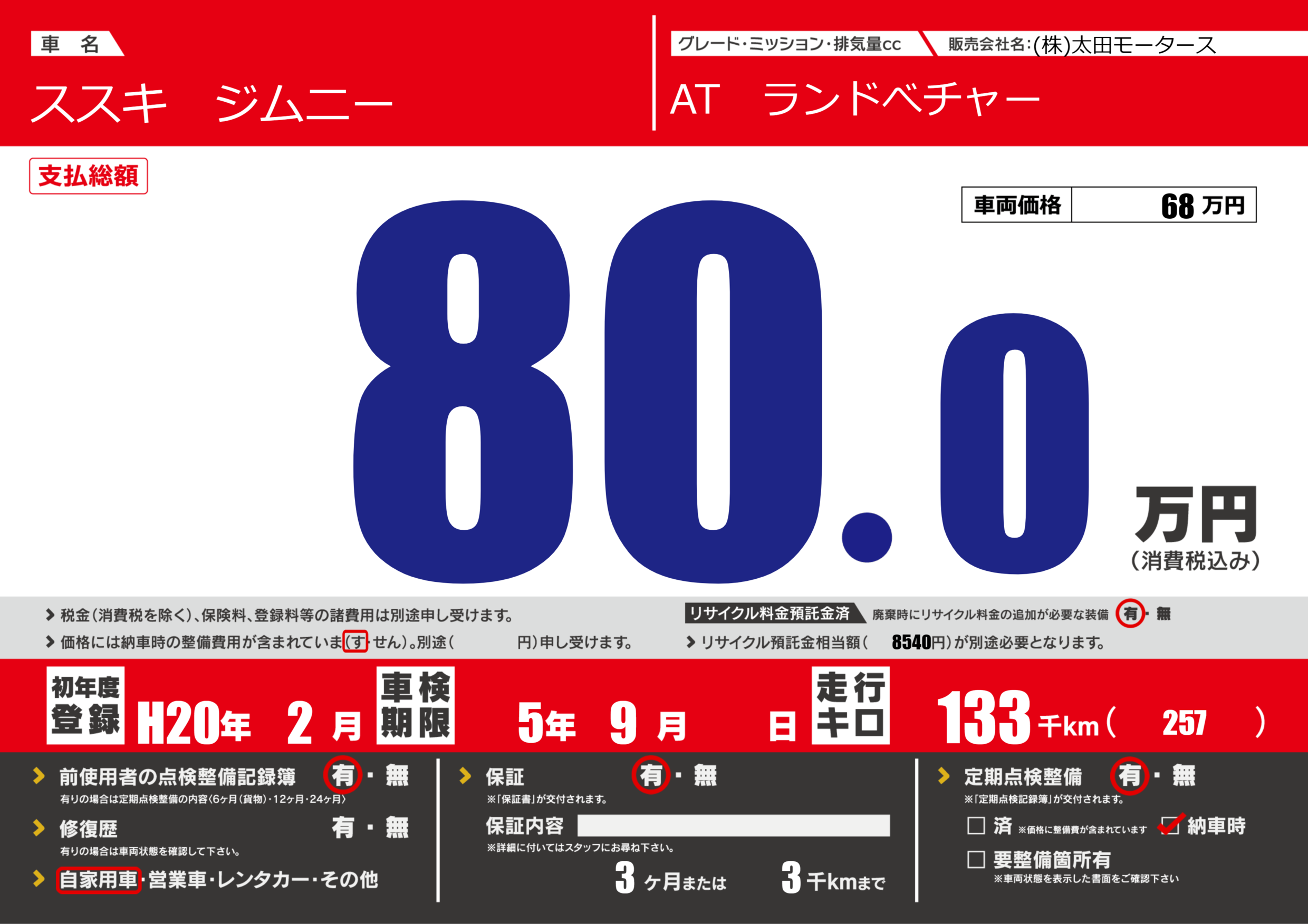 保証付き 保証内容(---) 3ヶ月または(3)千kmまで |