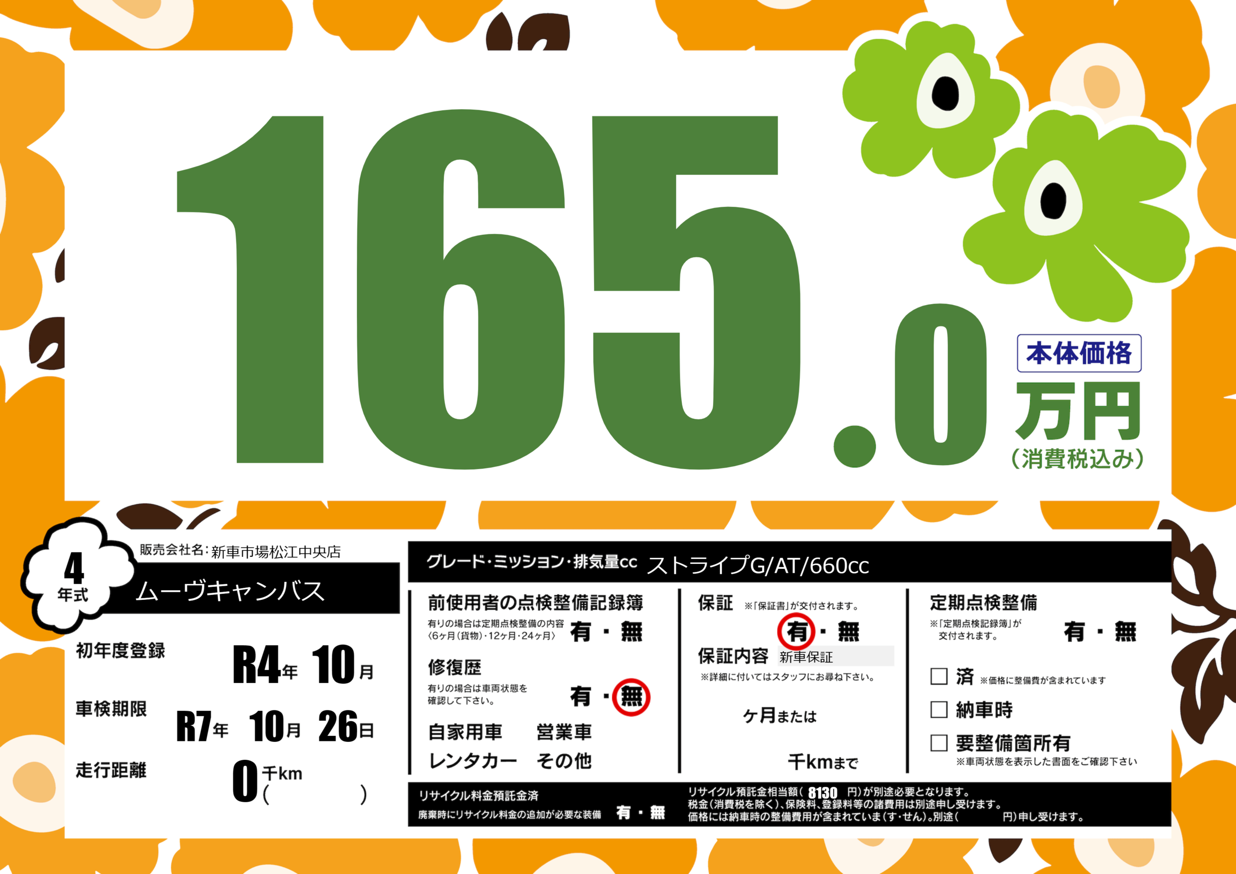 | 車名 | ムーヴキャンバス | グレード ミッション 排気量 |