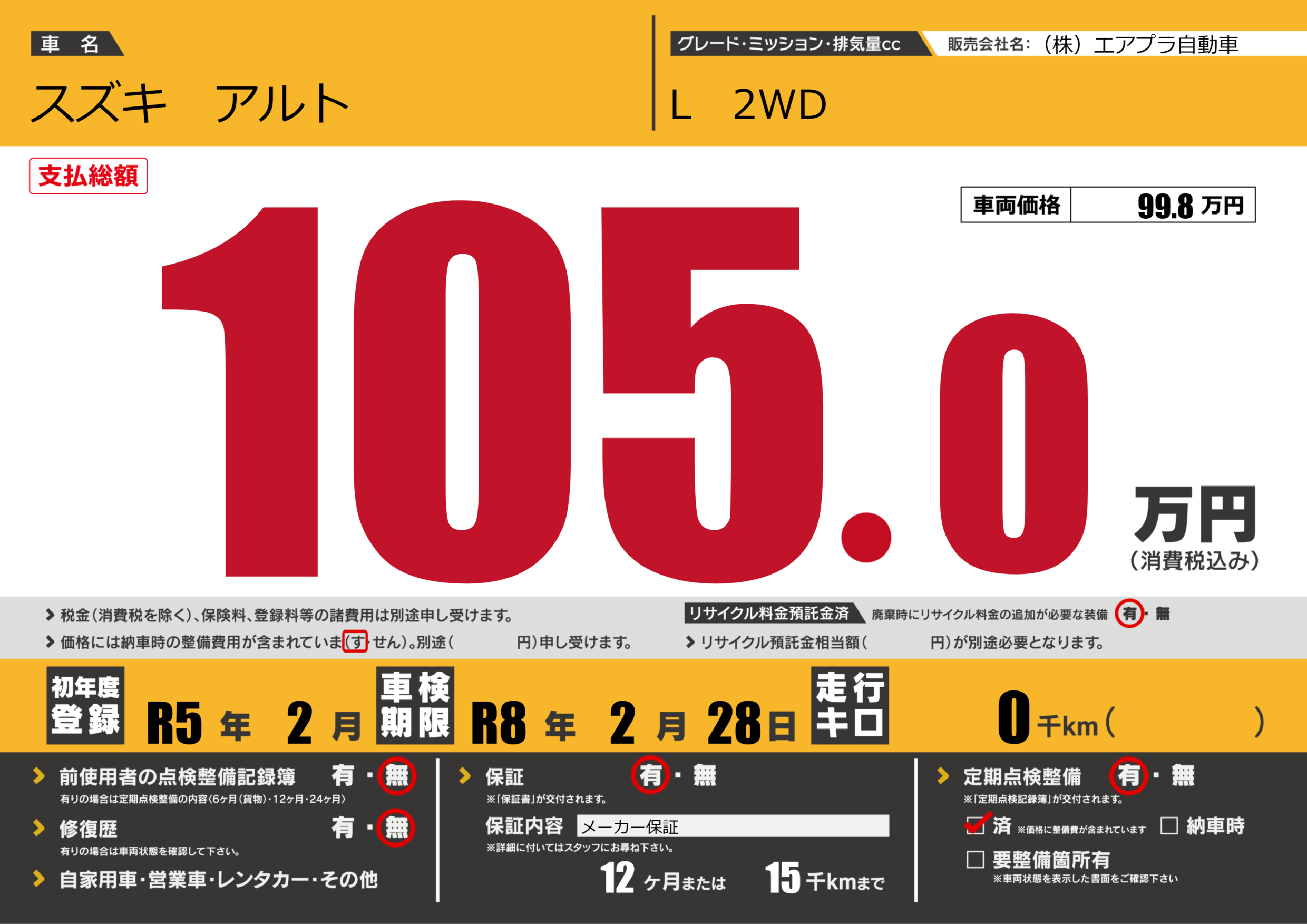 | 定期点検整備 | 定期点検整備あり 定期点検整備済み | ||