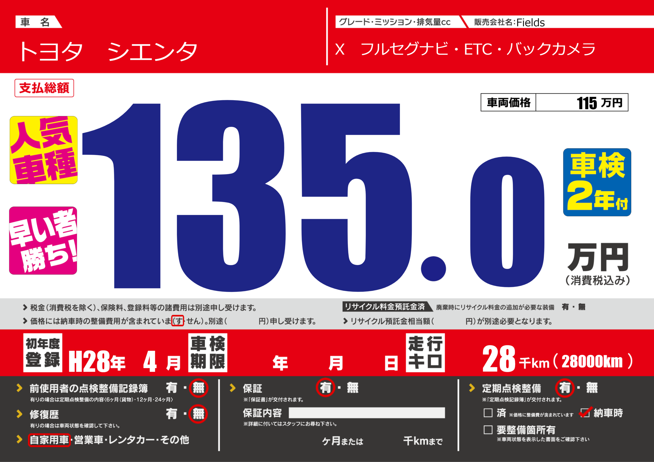 | 車名 | トヨタ シエンタ | グレード ミッション 排気量 |