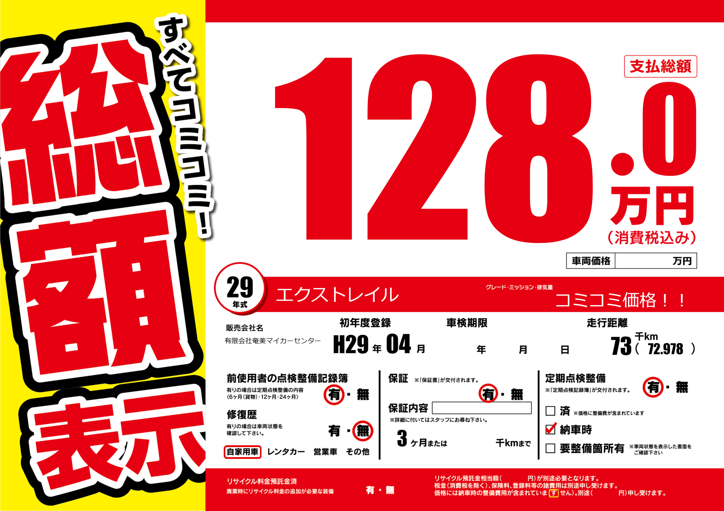 | 定期点検整備 | 定期点検整備あり 納車時あり | ||