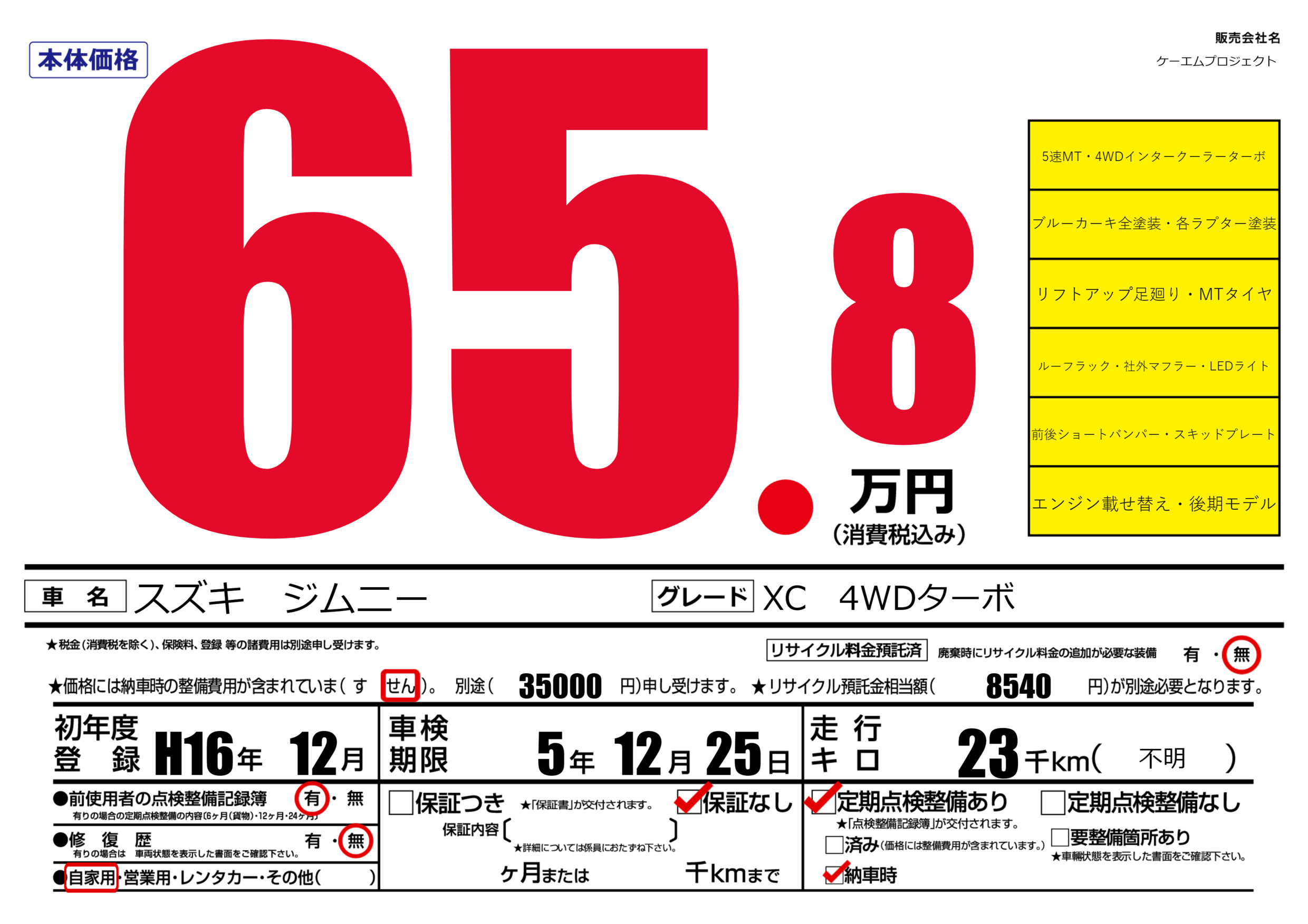 | 車名 | スズキ ジムニー | グレード ミッション 排気量 |