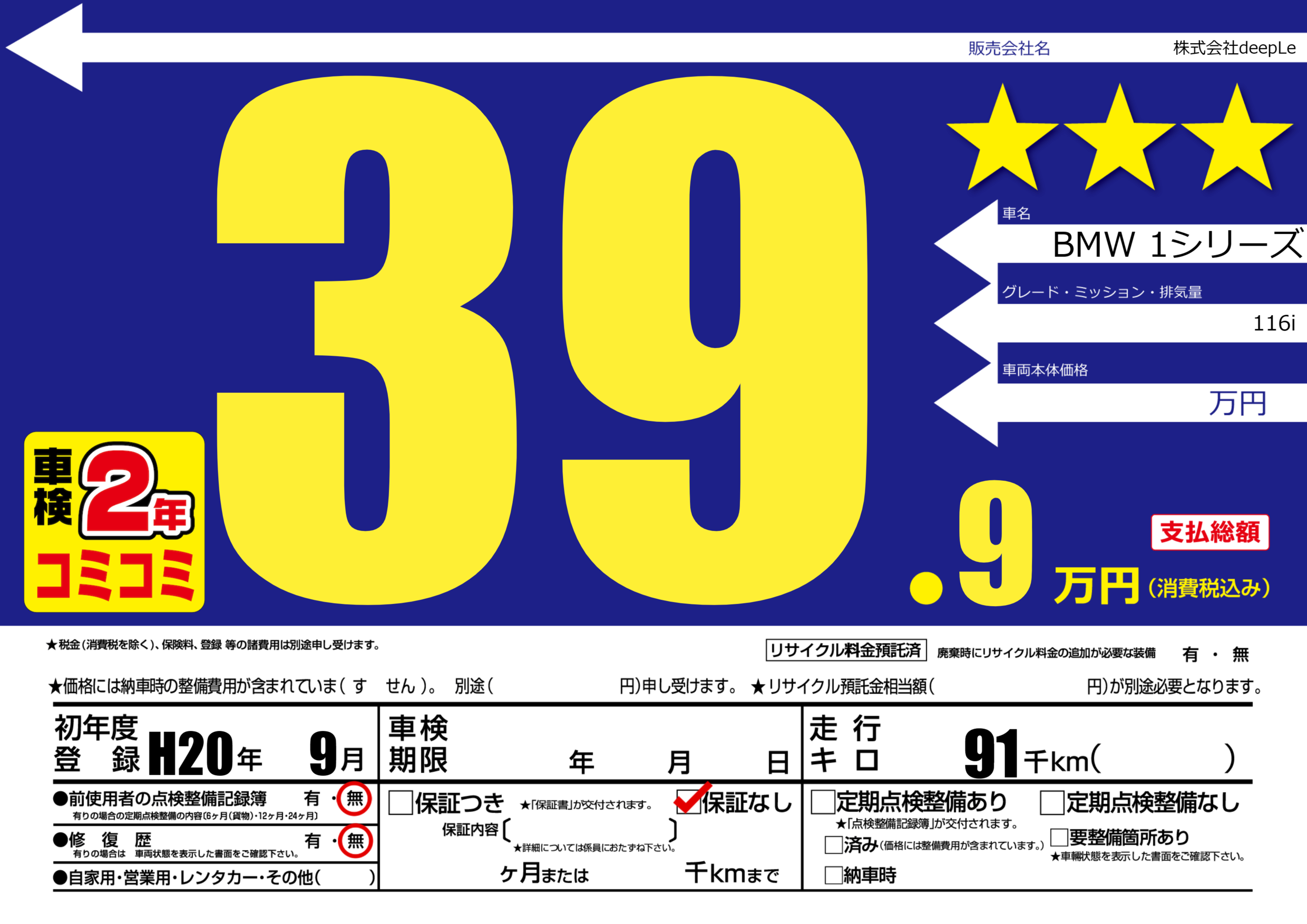 | 走行キロ | 9.1万km | 初年度登録 | H20年9月 |