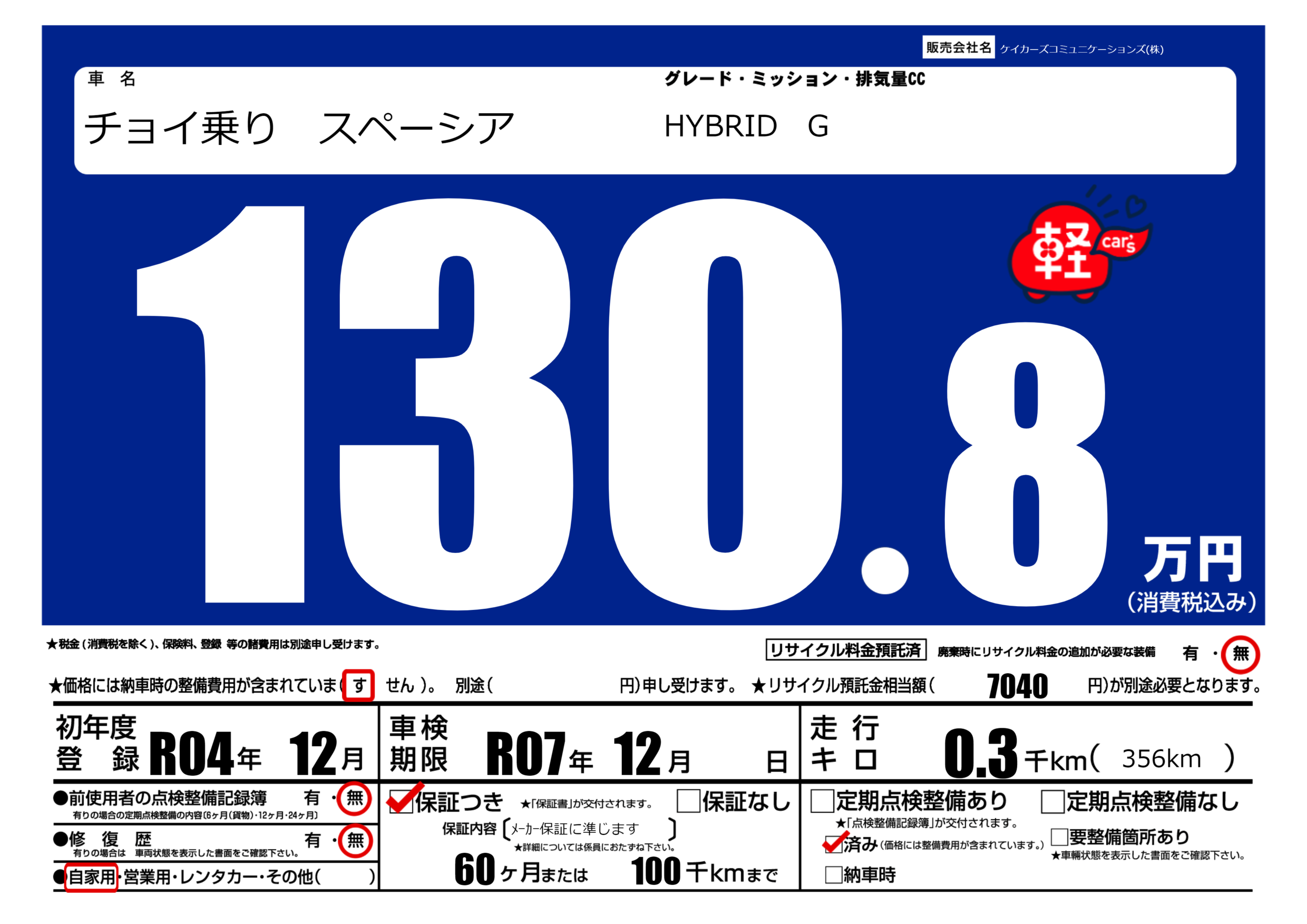 | 車名 | チョイ乗り スペーシア | グレード ミッション 排気量 |