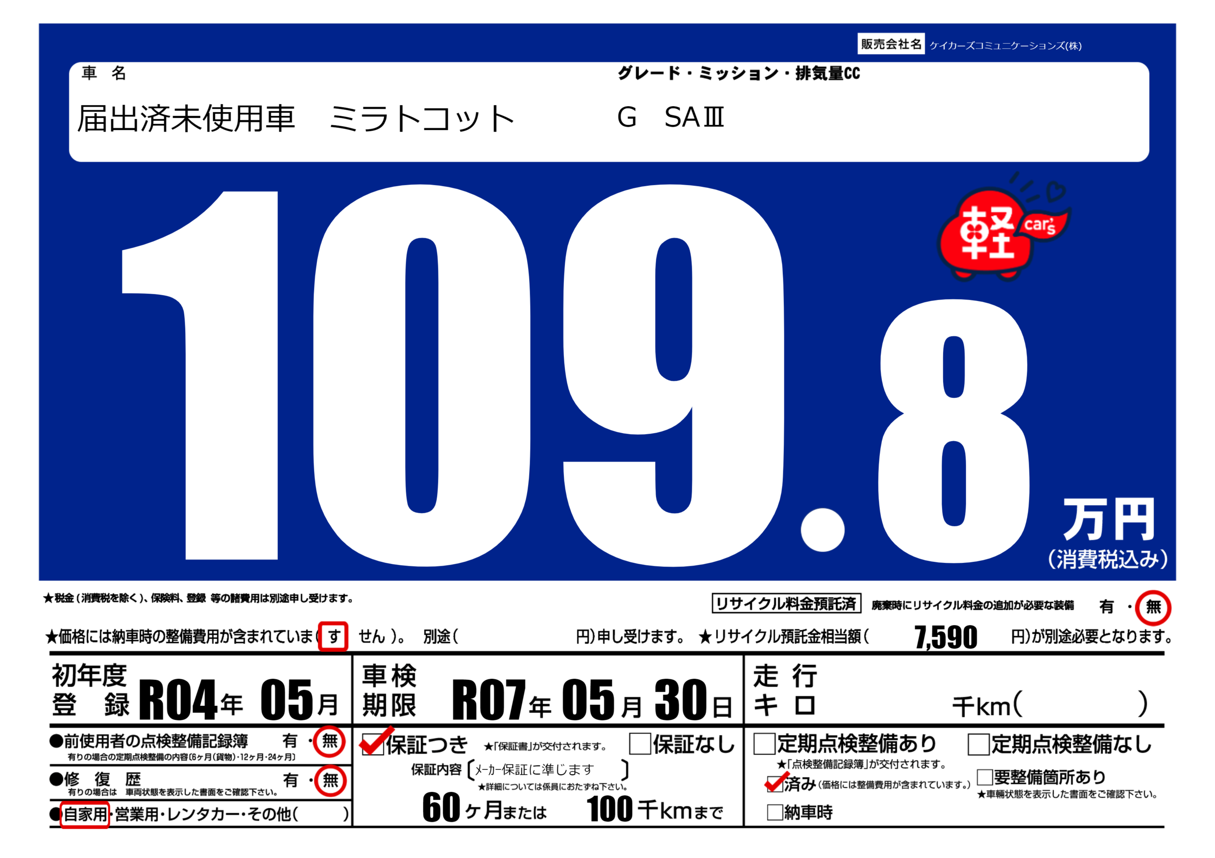 | 車名 | 届出済未使用車 ミラトコット | グレード ミッション 排気量 |
