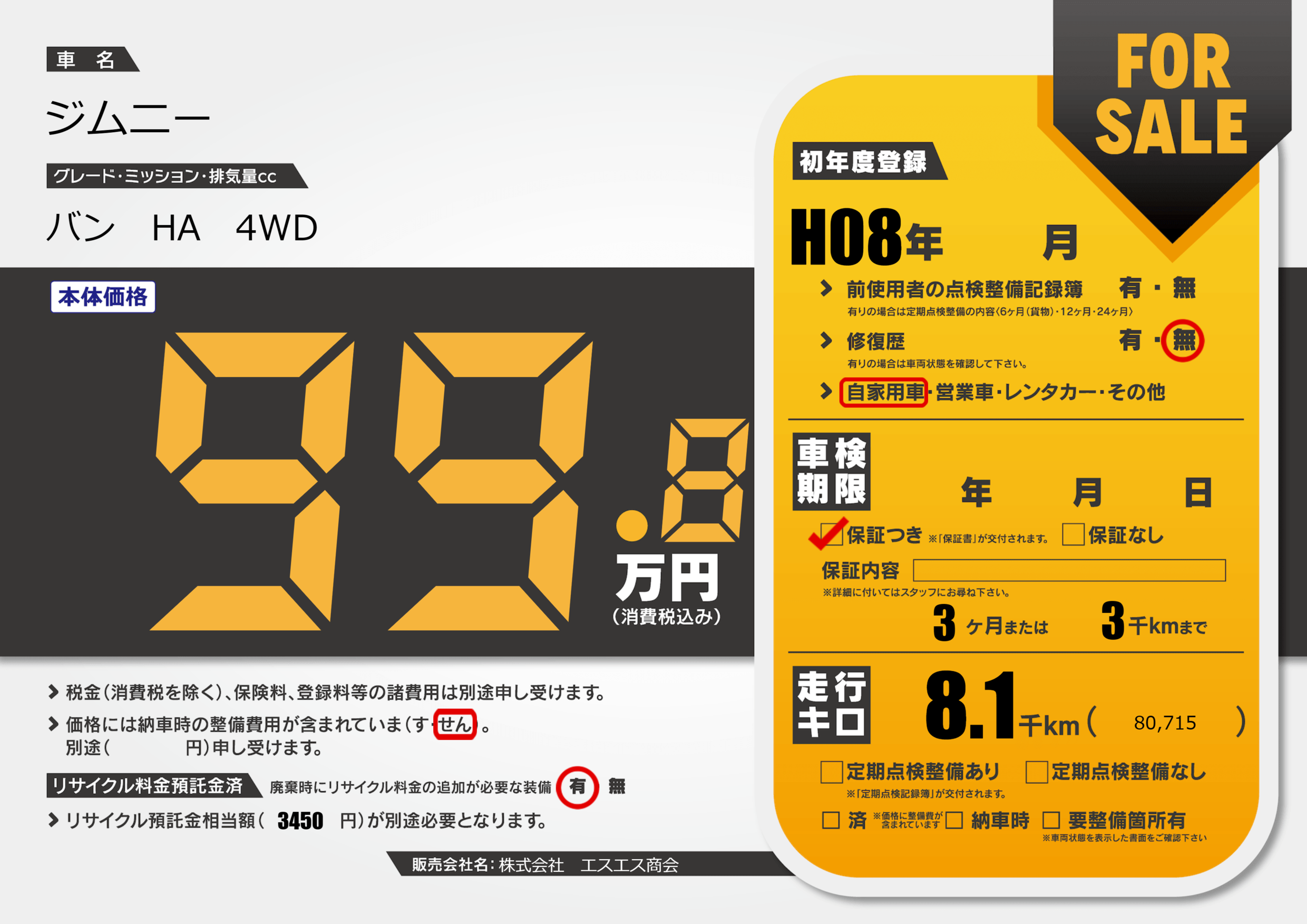 | 車名 | ジムニー | グレード ミッション 排気量 |