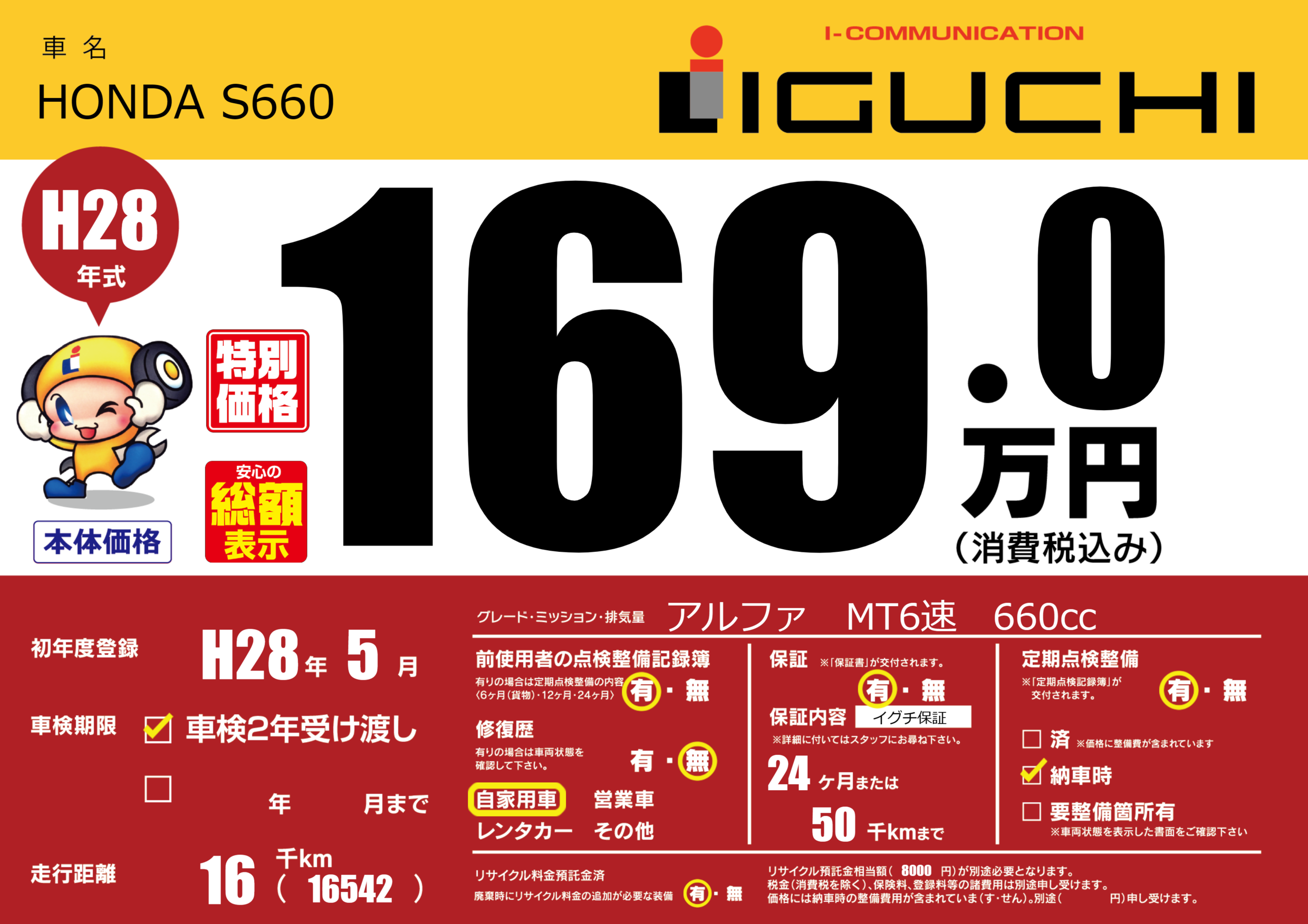 | 車名 | HONDA S660 | グレード ミッション 排気量 |