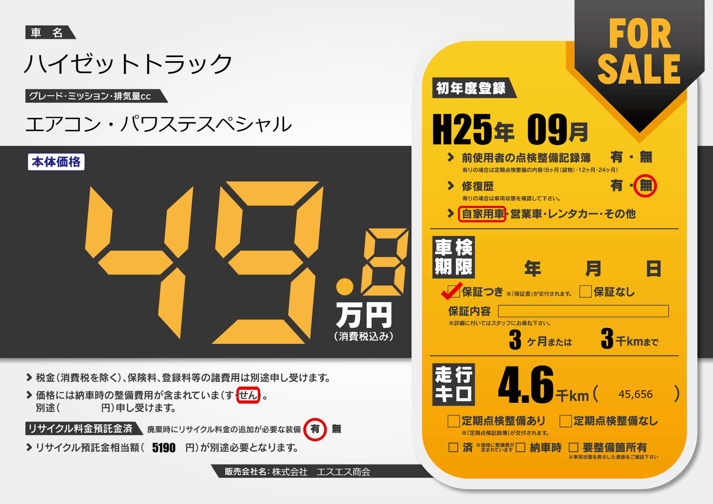 | 車名 | ハイゼットトラック | グレード ミッション 排気量 |