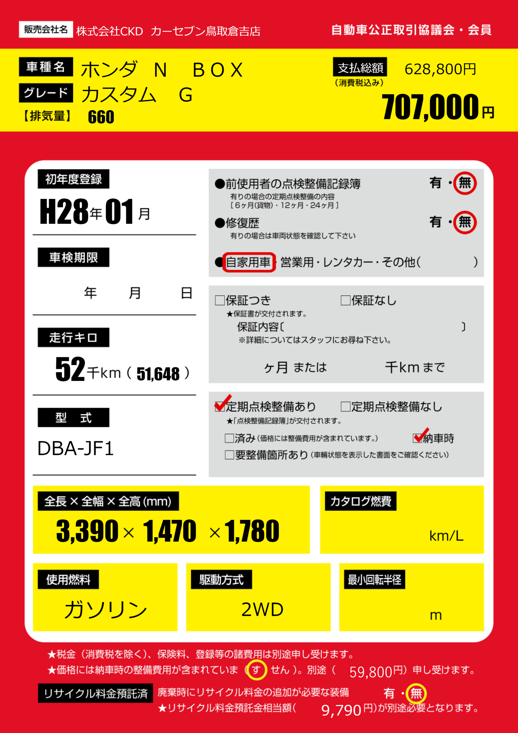 | 車名 | ホンダ N BOX | グレード ミッション 排気量 |
