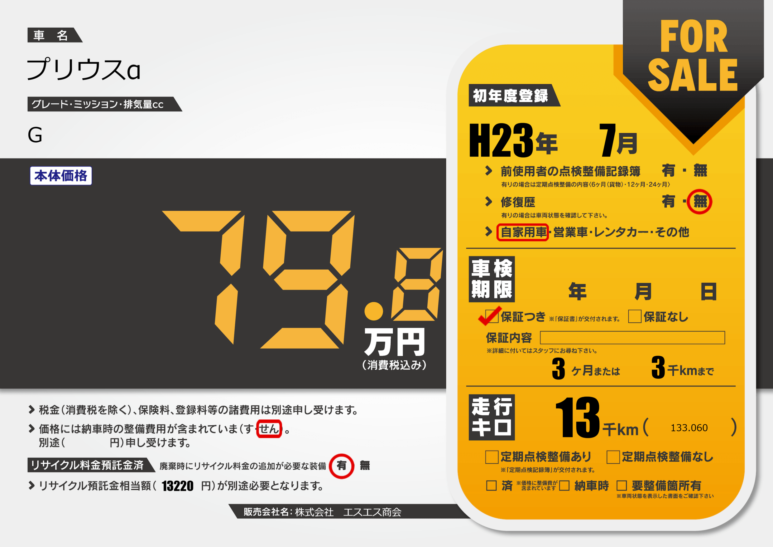 保証付き 保証内容(---) 3ヶ月または(3)千kmまで |